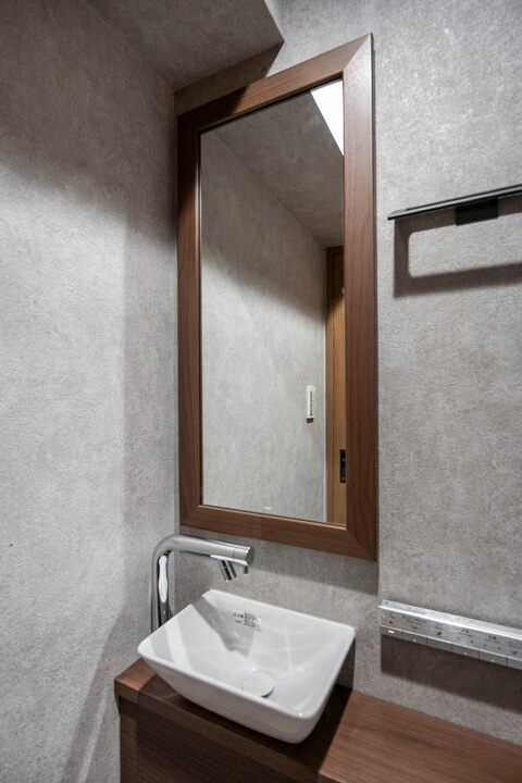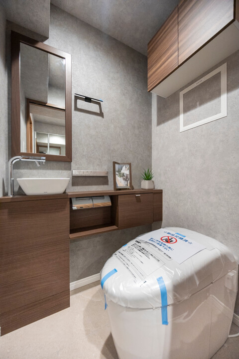 洗面室に接続するレストルーム。TOTO製の温水洗浄機能付トイレに交換済みです。タンクレス仕様でスタイリッシュですね。手洗いカウンター付きなのですぐに手を洗うことができ、ゲストを洗面室まで案内する手間もかかりません。