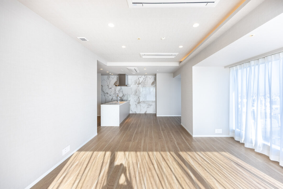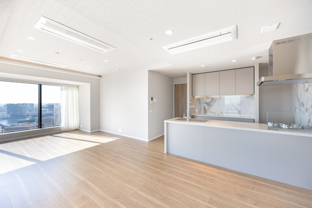 大開口の窓が連なる、開放感あふれるリビングダイニング。南東向きの2面採光により、あたたかい陽光が室内全体を包み込みます。40階ならではの視界の広がりも魅力で、窓の先には澄んだ青空と穏やかな運河の景色が広がり、日常のひとときに心地よい余白を添えます。キッチンスペースを含めて約22.5帖のゆとりある広さで、家族が自然と集う住空間です。