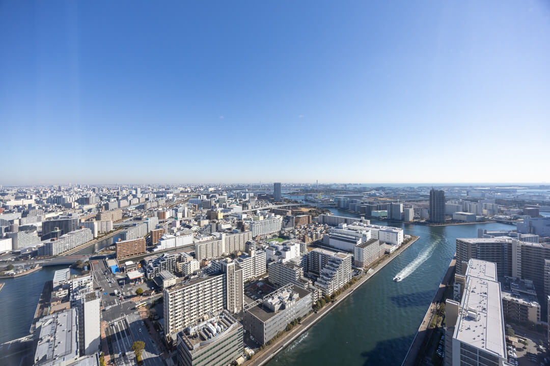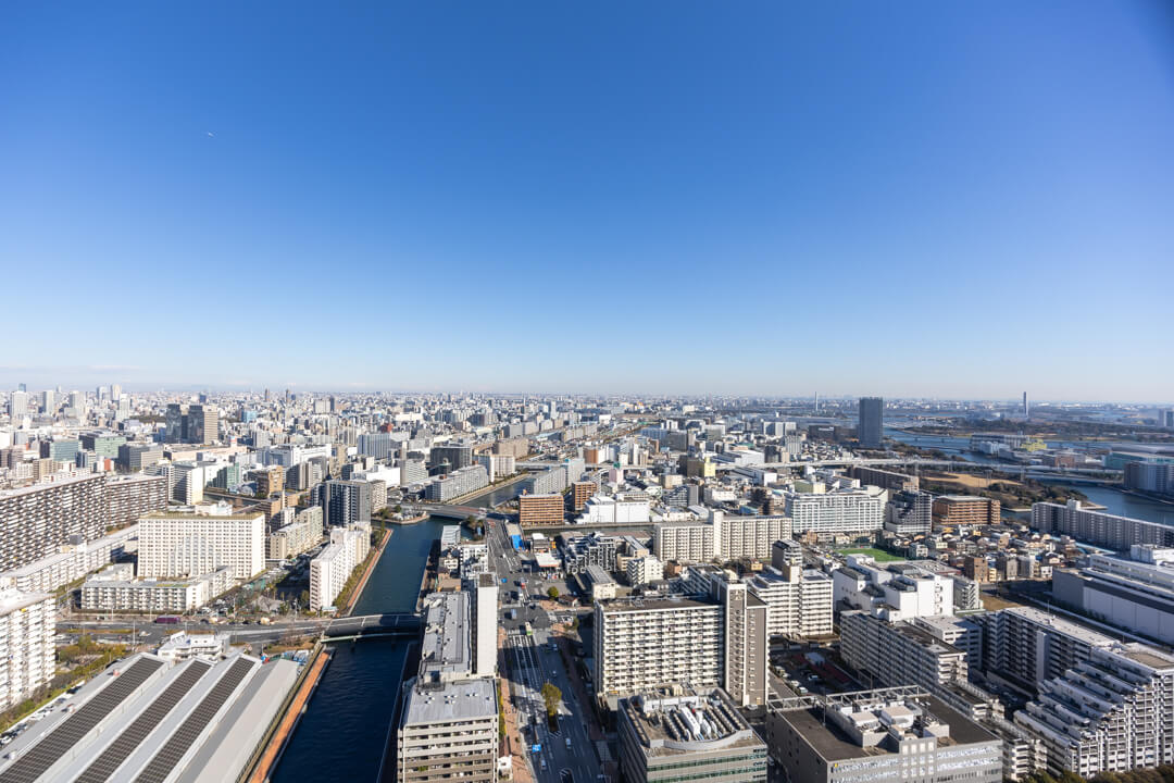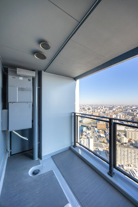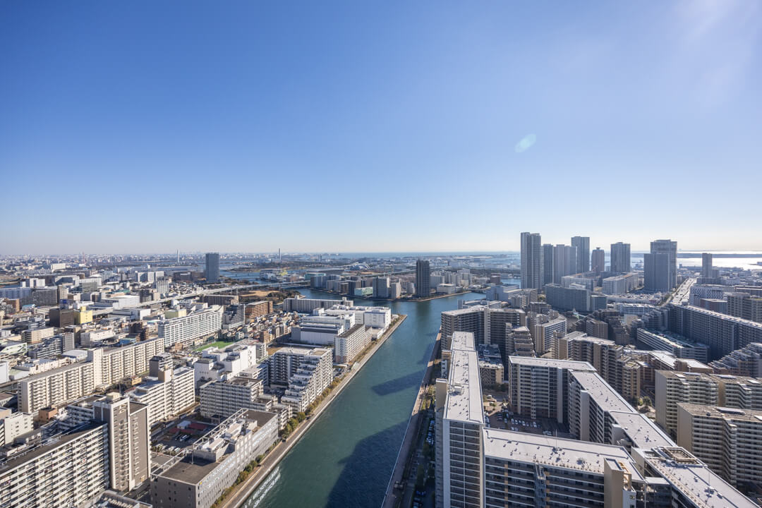 寝室1に面した東向きのバルコニー。晴れた日には午前中から心地よい光が届きそうです。40階ならではの開放感ある眺望も魅力で、雄大な空と穏やかな運河の景色が、都心での暮らしにやすらぎをもたらします。