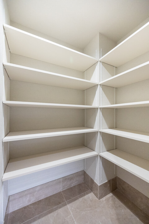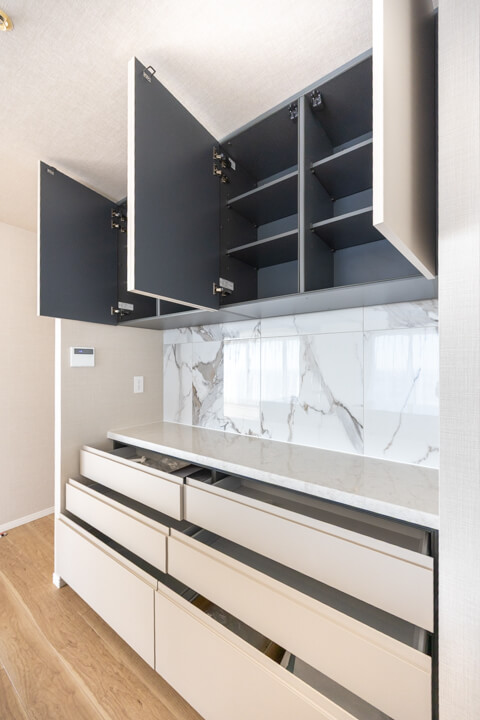 背面には収納力のあるカップボードを完備。キッチンと同じデザインで統一感があります。食料品のストックや食器類を整理整頓でき、散らかりがちなキッチンまわりがすっきり片付きそうです。カウンター部分は作業スペースとしても活躍しそうです。