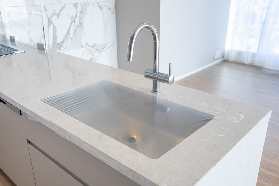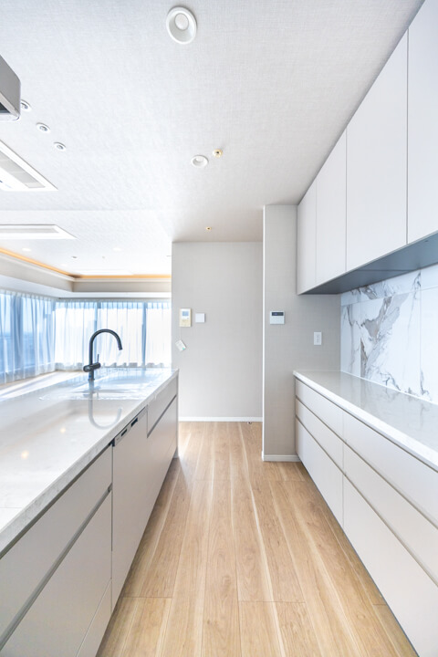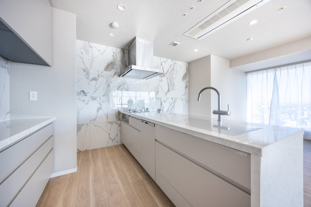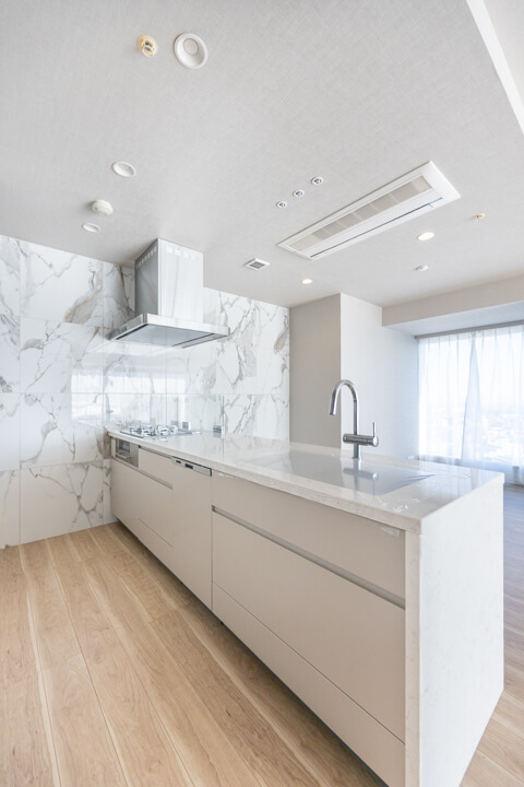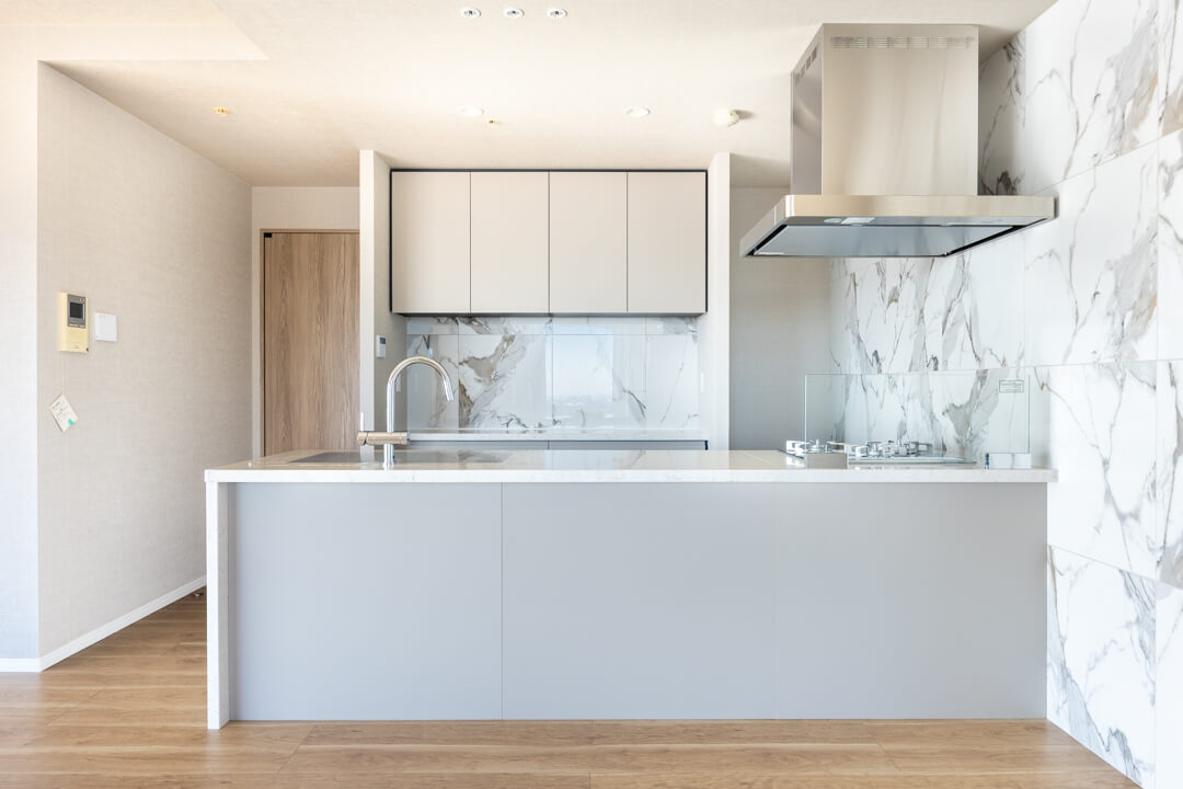大理石調のアクセントウォールが高級感を演出するキッチン。リビングダイニングを見渡せる人気の対面タイプです。コンロ前にはガラスガードが設置されているので、リビング側への油跳ねの心配はありません。開放的な気分で調理ができ、家族のコミュニケーションも増えそうですね。