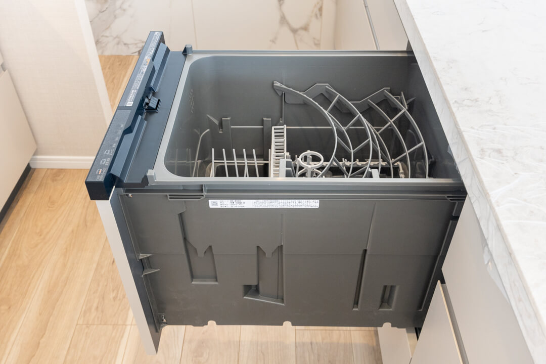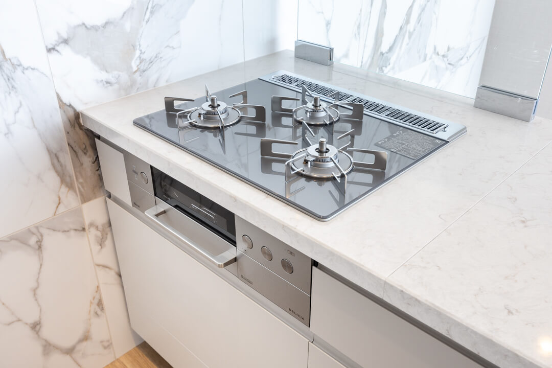 同時調理が叶うグリル付3口ガスコンロを内蔵。さらに、ディスポーザーと食洗機も完備されています。料理後すぐに生ゴミを処理できるので、悪臭の原因を防ぎ、掃除の手間を軽減。食器洗いも捗り、後片付けの時短が叶います。