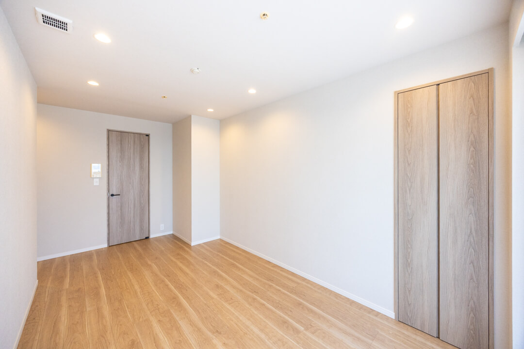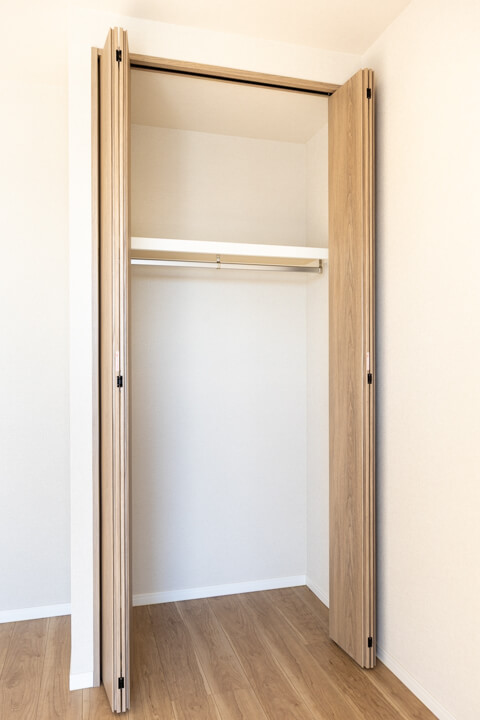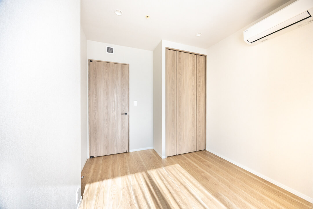 玄関を入って突き当たりにある寝室2。約5.6帖です。大開口の窓から自然光が差し込み、明るく開放的な空間です。こちらのお部屋にもWIC(ウォークインクローゼット)があり、収納力も充実。内部にはハンガーパイプと可動棚を設置し、衣類から小物まで整理しやすく、すっきりとした暮らしを支えます。