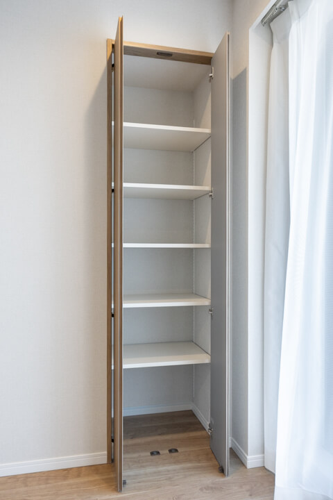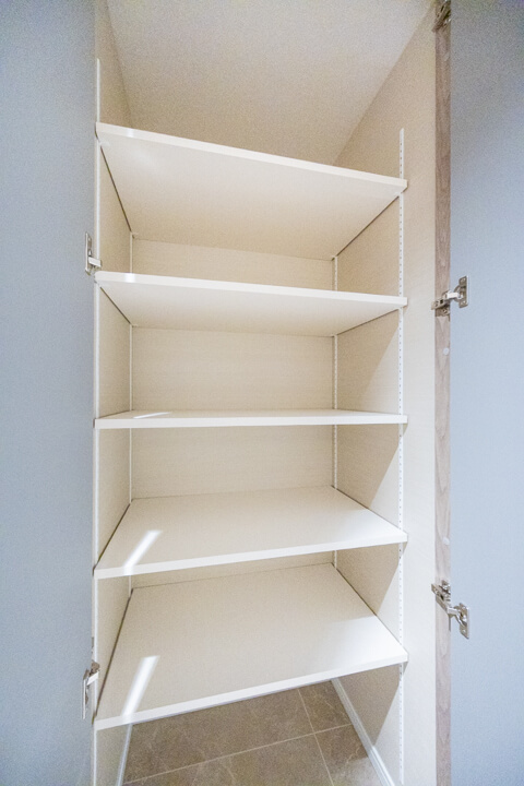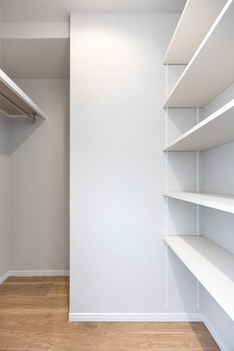 WIC(ウォークインクローゼット)完備で収納力◎。ハンガーパイプと枕棚がコの字に設置されていて、隅々までたっぷり収納できます。衣類はもちろん、トランクケースやゴルフバッグといった大きな荷物も収納でき、居室空間を広々と使うことができますよ。室内には小物の収納に便利な可動棚も完備しています。