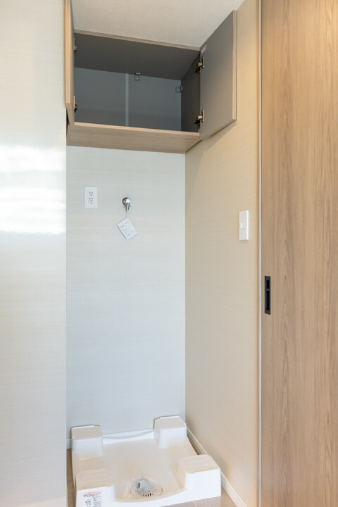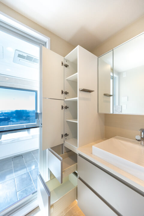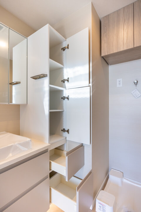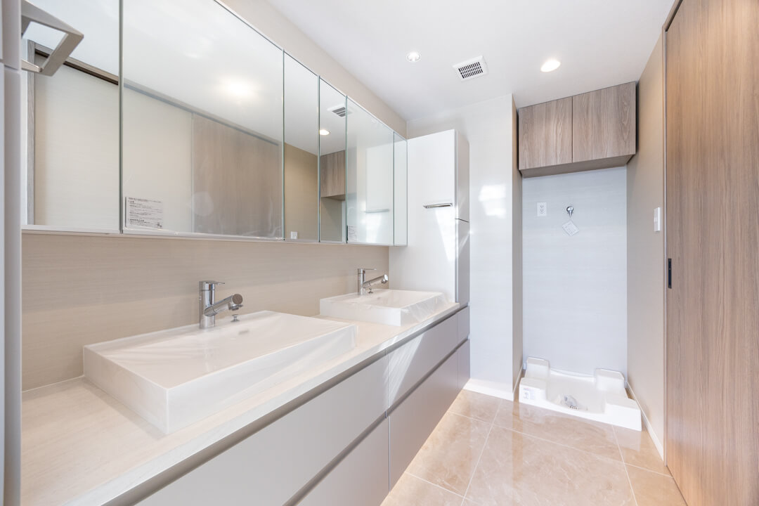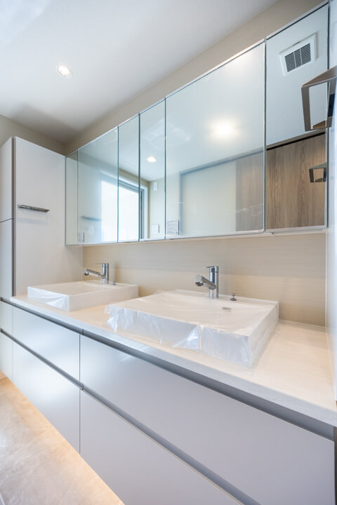 2つの洗面ボウルが並ぶ、ホテルライクな洗面化粧台。2人同時に使用でき、忙しい朝の身支度も安心です。左右にキャビネットがあり、収納性の高さも魅力。洗面まわりの小物から、タオル・パジャマ類までたっぷり収納できます。