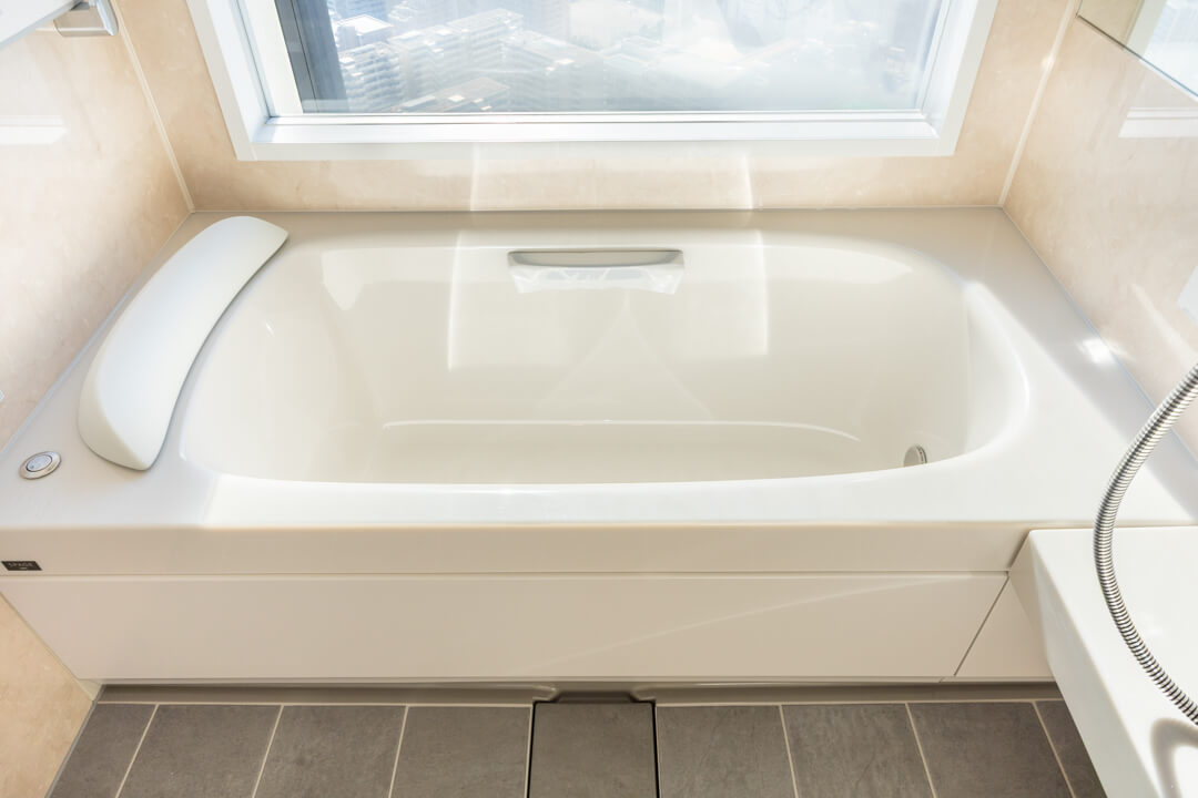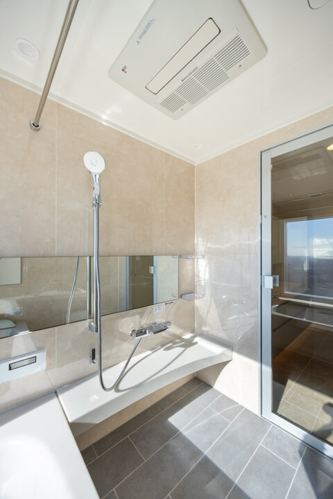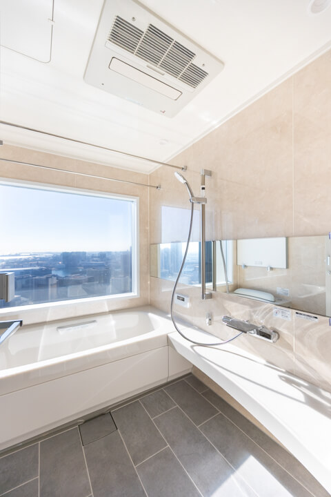 青空と運河を望む、開放的なビューバス。ゆったり入浴できる1620サイズです。明るい光が届く南向きで、目覚めのシャワーもより一層心地よい時間になりそうです。寒い日も快適に入浴でき、カビ対策や雨の日のお洗濯にも活躍する浴室換気乾燥暖房機を搭載しています。