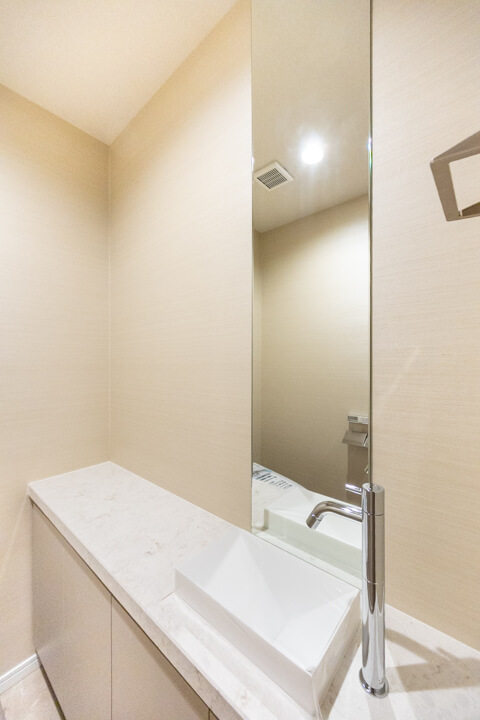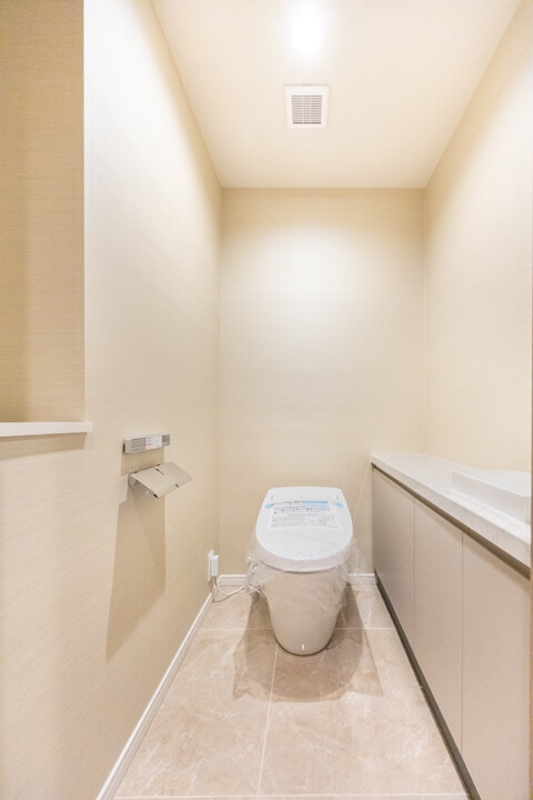 廊下に面していて独立性の高いレストルーム。明るく清潔感のある空間です。すっきりとした見た目のタンクレストイレに交換済み。手洗いカウンター付きなのですぐに手を洗うことができて衛生的です。ゲストを洗面室まで案内する手間がかからないのも助かりますね。