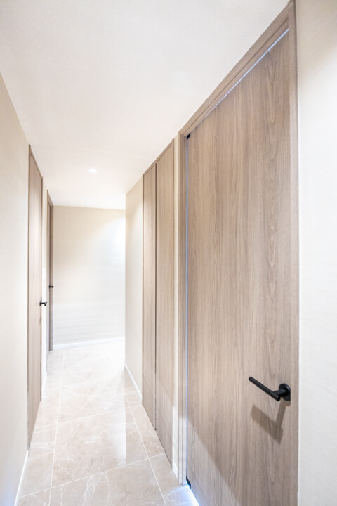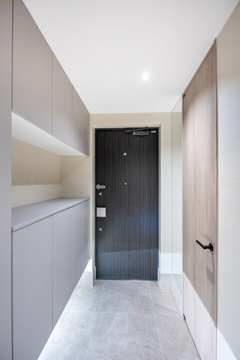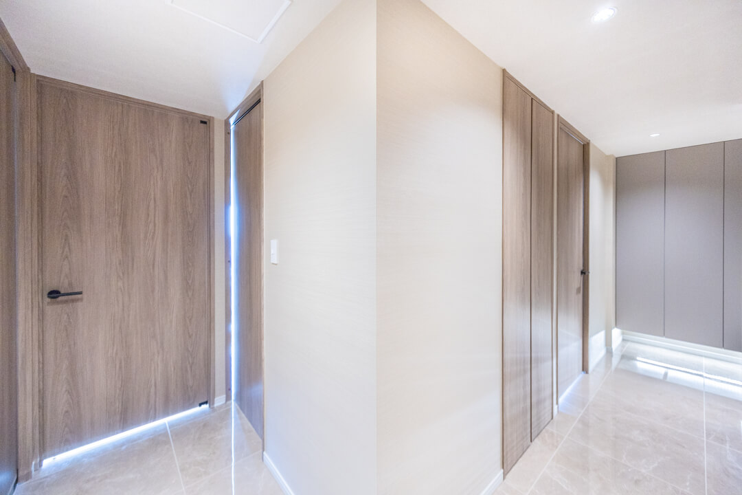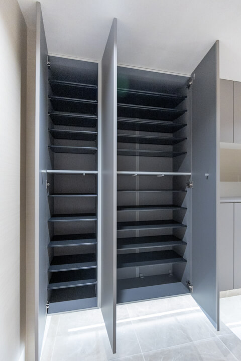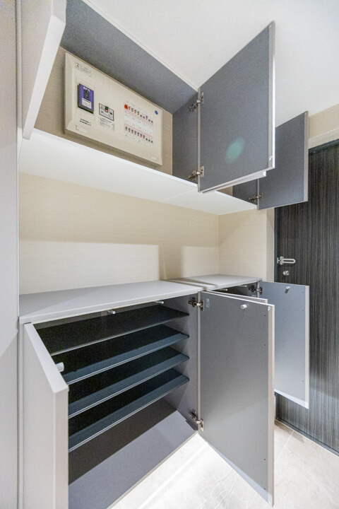 タイルフロアで高級感の漂う玄関ホール。フットライトの明かりが足元を幻想的に照らします。大容量のシューズボックスに加え、SIC(シューズインクローゼット)も付いていて、収納性に優れています。靴はもちろん、アウトドアグッズやペット用品も収納でき、すっきりとした居住空間を実現できそうです。