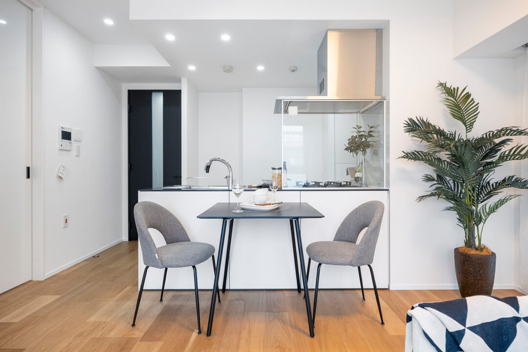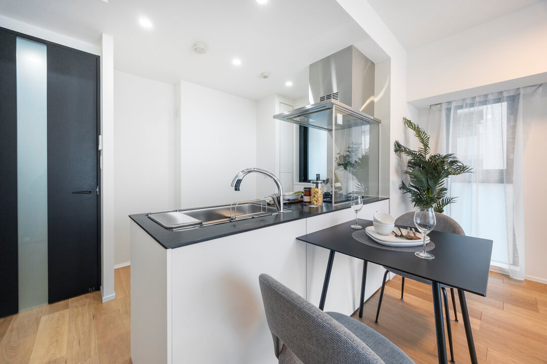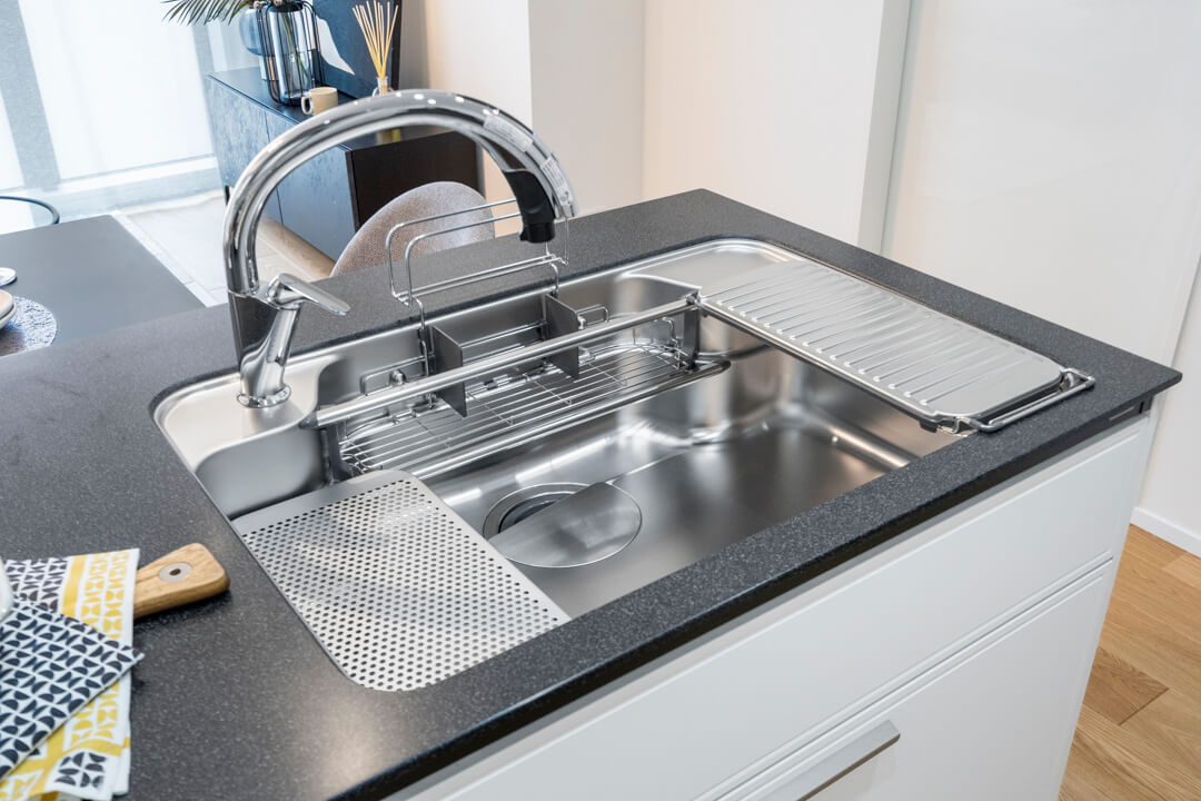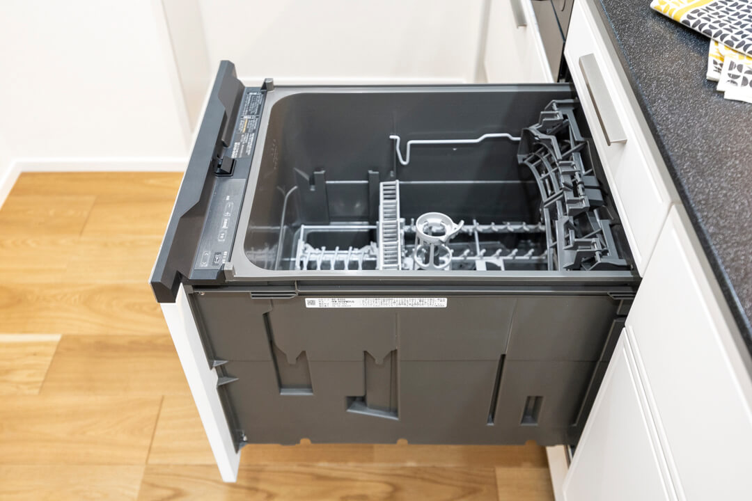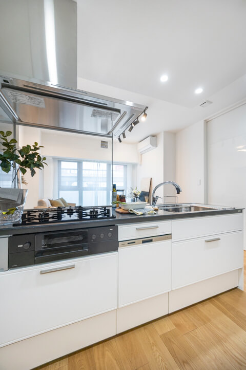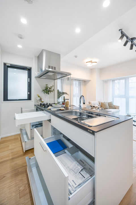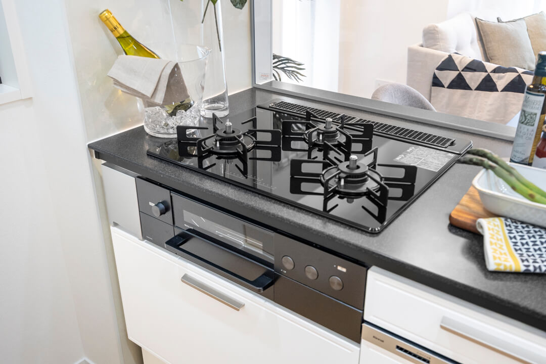 リビングダイニングを見渡せる開放的なオープンキッチン。家族やゲストと会話がしやすく、小さなお子さんがいるご家庭では子どもの姿も見守れます。ハンズフリー水栓、食洗機、3口ガスコンロ付きで設備も充実。モノの出し入れがしやすい引き出し式のキャビネットで使い勝手の良さもポイントです。パントリーも設置されていて、収納もしっかりと確保されています。