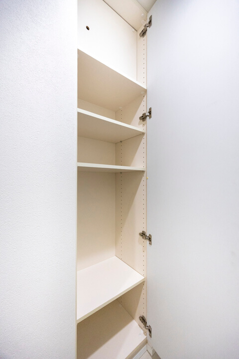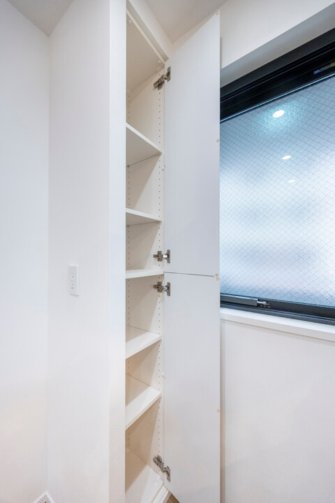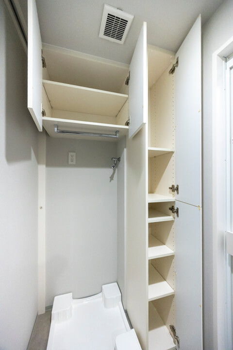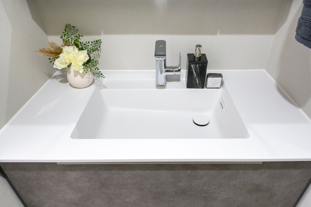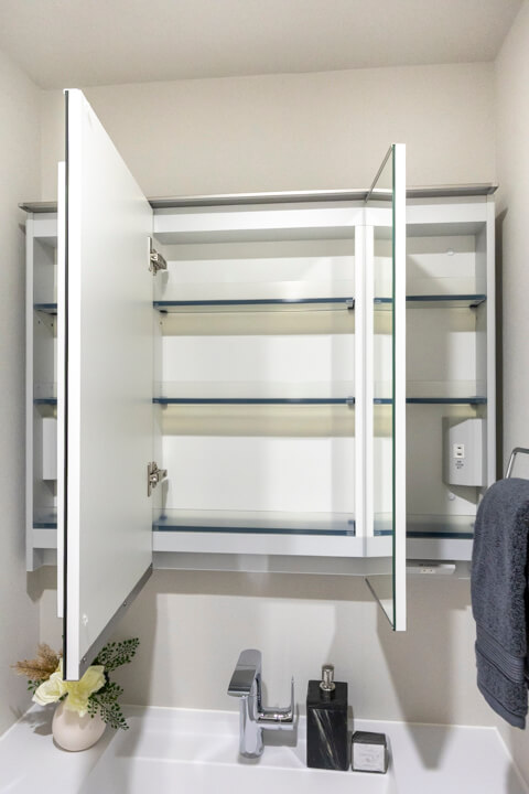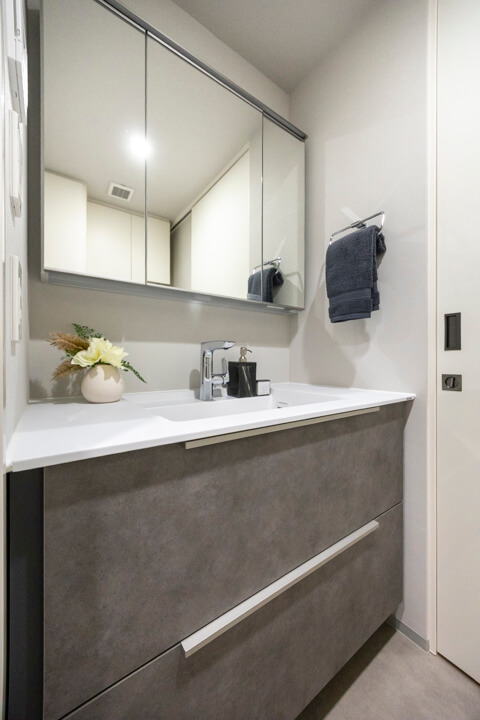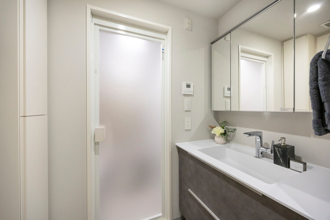 洗面化粧台は洗面まわりの小物がすっきり整頓できるミラーボックスや、モノの出し入れがしやすい引き出し式のキャビネット付きで使い勝手の良さもポイント。別途、リネン庫も設置されていて、収納スペースもしっかりと確保されています。