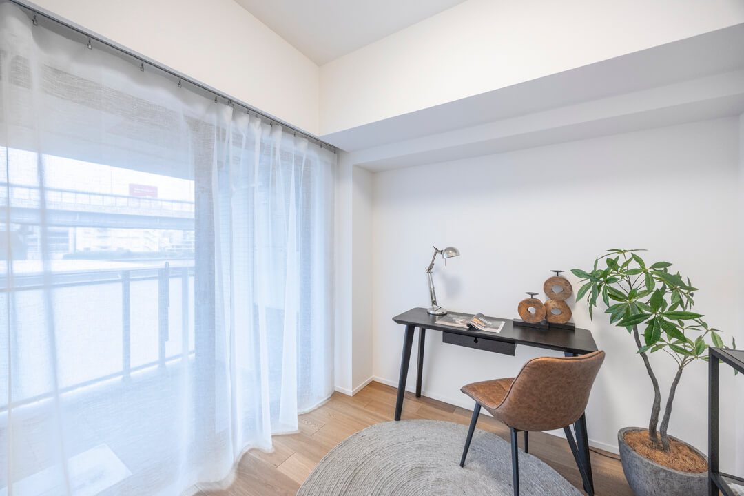 約4.3帖の洋室。リビングダイニングから直接出入りできる動線で、家族とのコミュニケーションが取りやすくなっています。バルコニー付きで開放感も感じられます。クローゼットも備わっています。