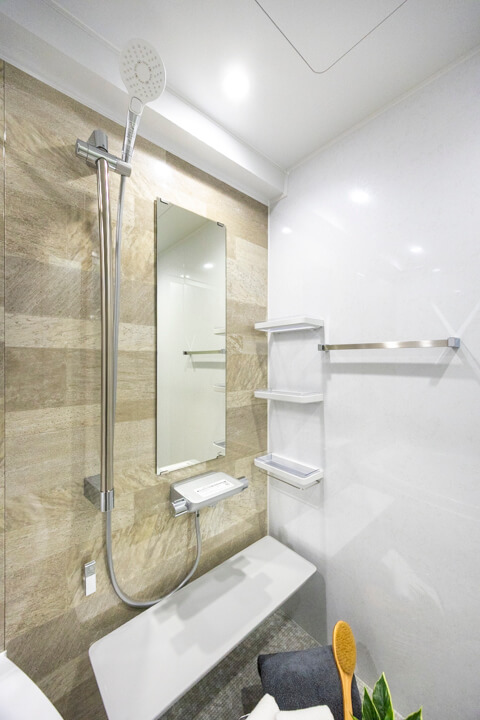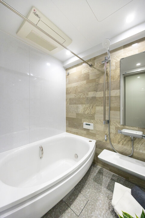 TOTO製のユニットバス。追い炊き機能の他、乾燥・換気・暖房・涼風の4つの機能が備わっていて、一年中快適にバスタイムが楽しめます。また、ランドリーパイプも設置されていて、雨の日や冬場の洗濯にも困りません。浴槽は節水効果もあるステップ付で、腰をかけることも可能です。