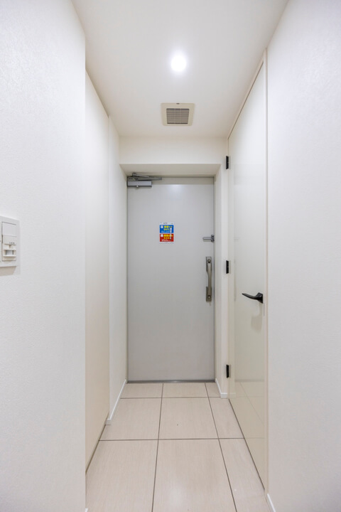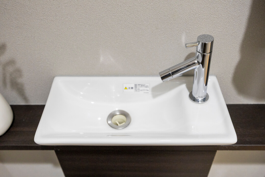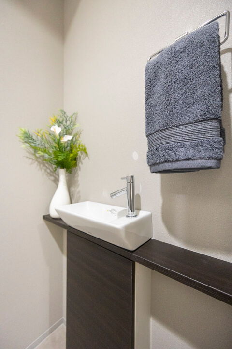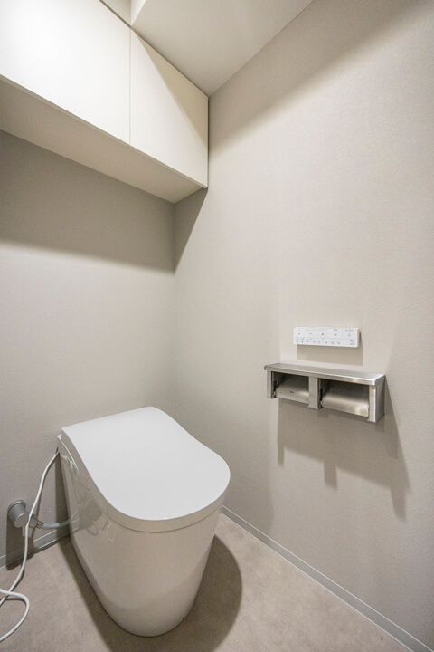 廊下に面したレストルーム。空間がすっきり見えるタンクレストイレです。手洗いカウンター、ウォシュレット、2ロールのペーパーホルダーも設置されています。
