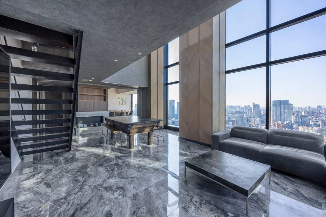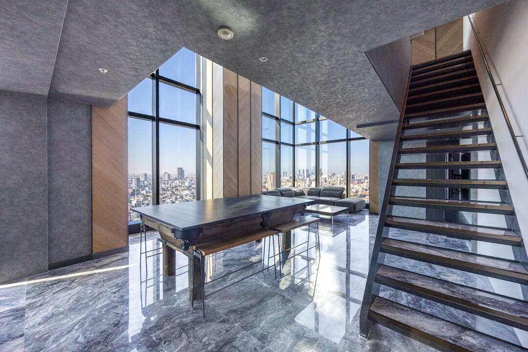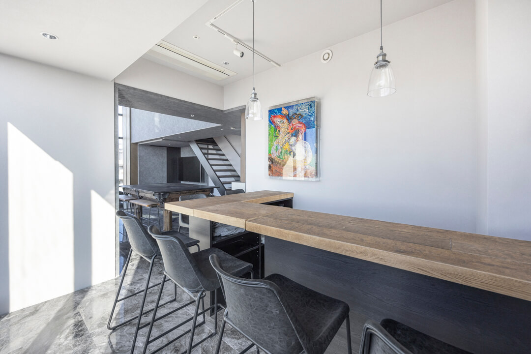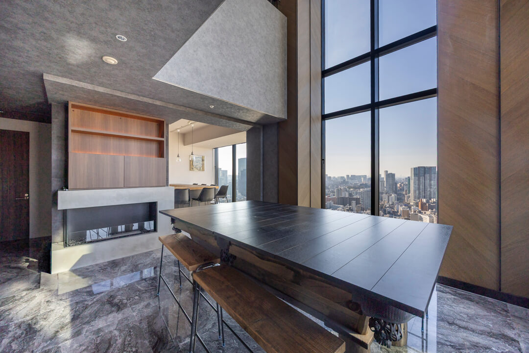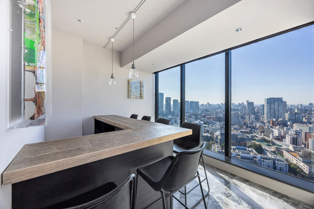 窓際には、景色を望むL字カウンターを設置。ダイニングやワークスペース、バーのような寛ぎの場としても活用でき、シーンに応じた多彩な使い方が可能です。眺望を身近に感じながら過ごす時間が、日常をより豊かなものにしてくれます。
