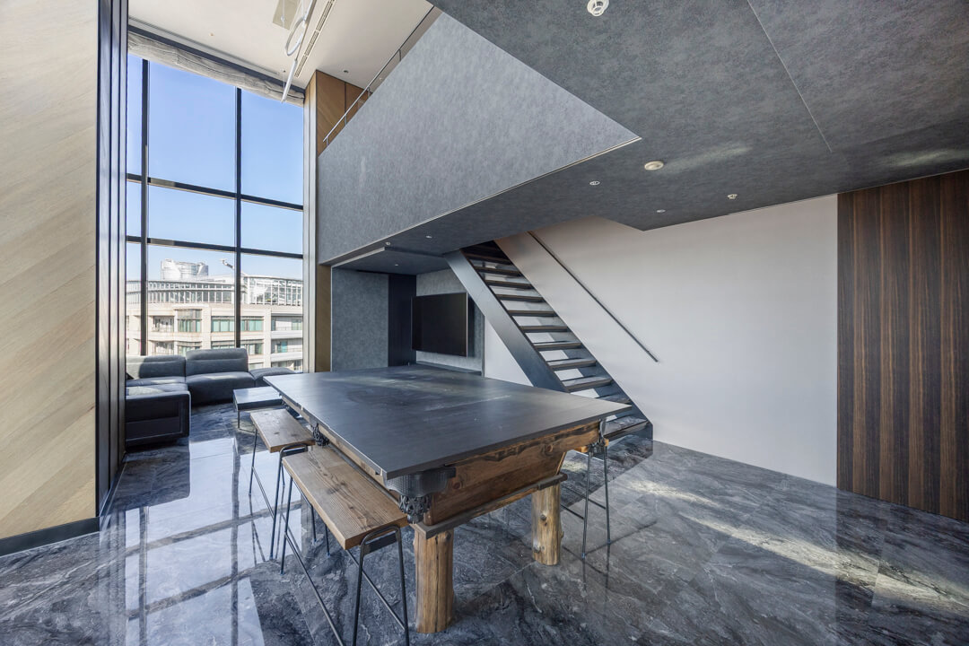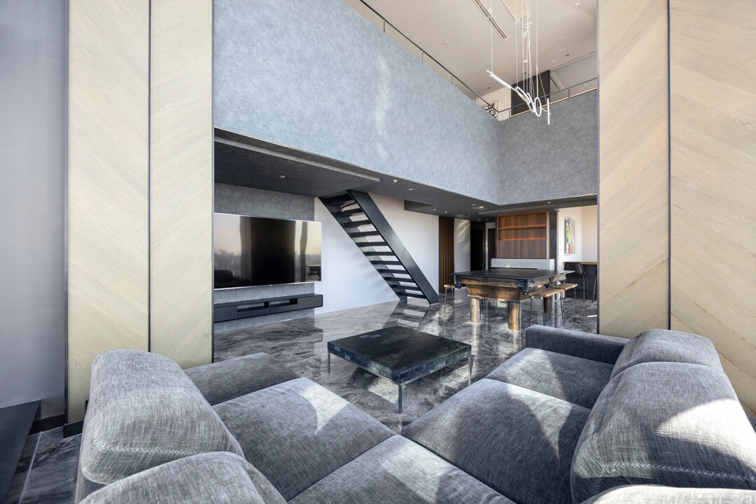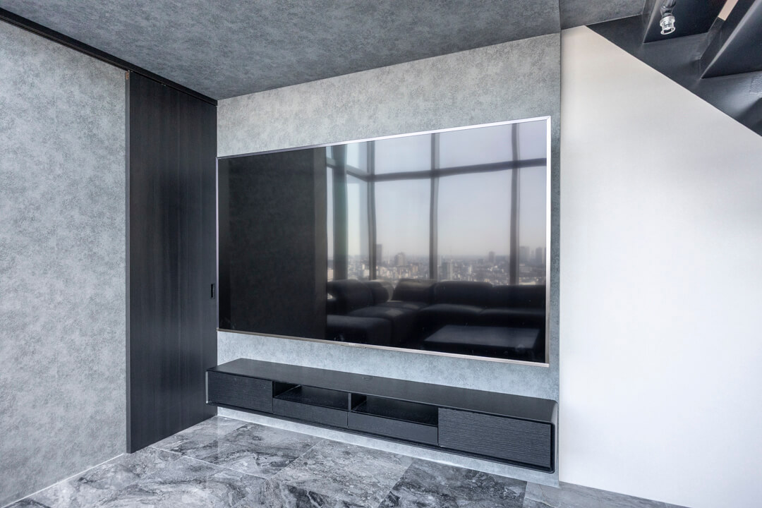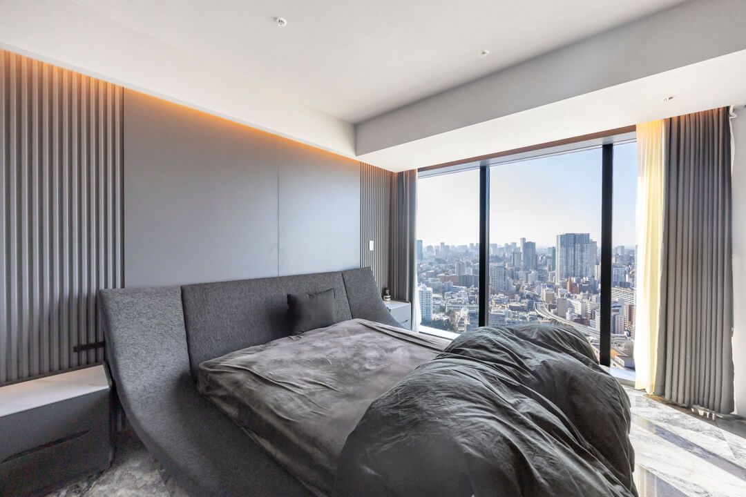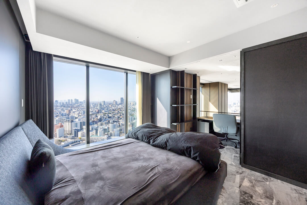窓際には、景色を望むL字カウンターを設置。ダイニングやワークスペース、バーのような寛ぎの場としても活用でき、シーンに応じた多彩な使い方が可能です。眺望を身近に感じながら過ごす時間が、日常をより豊かなものにしてくれます。