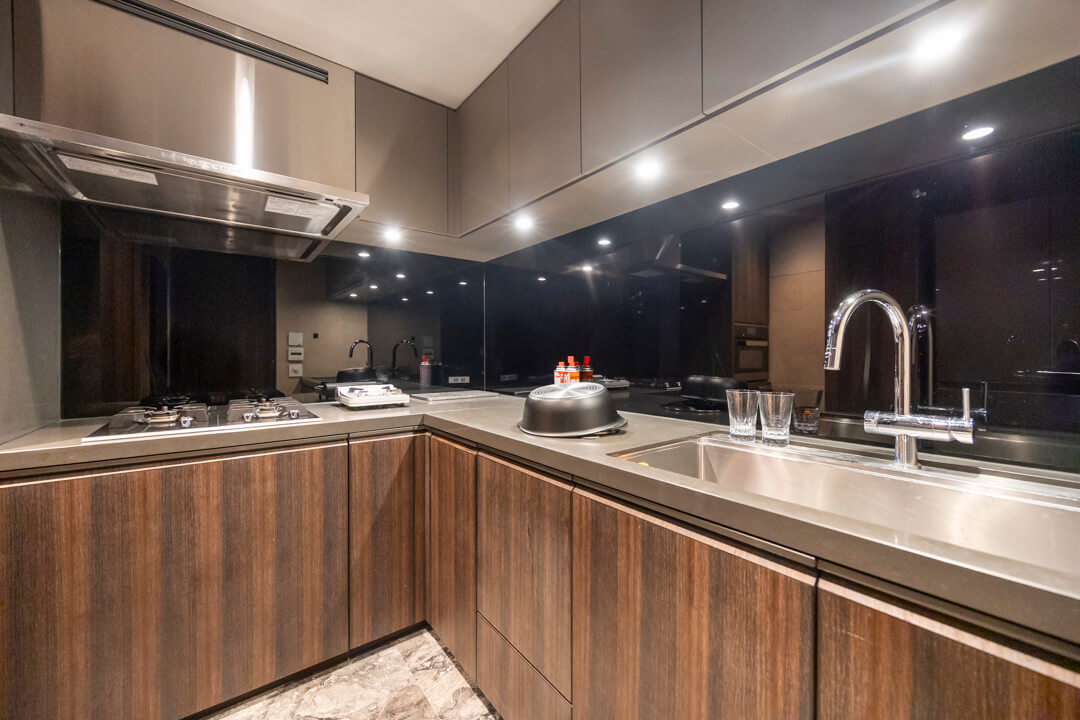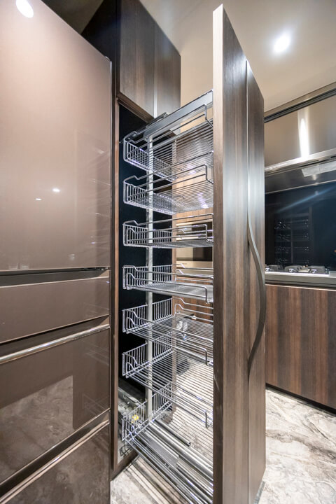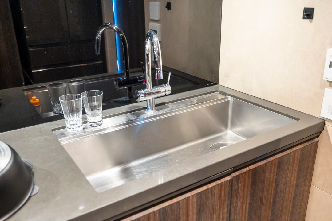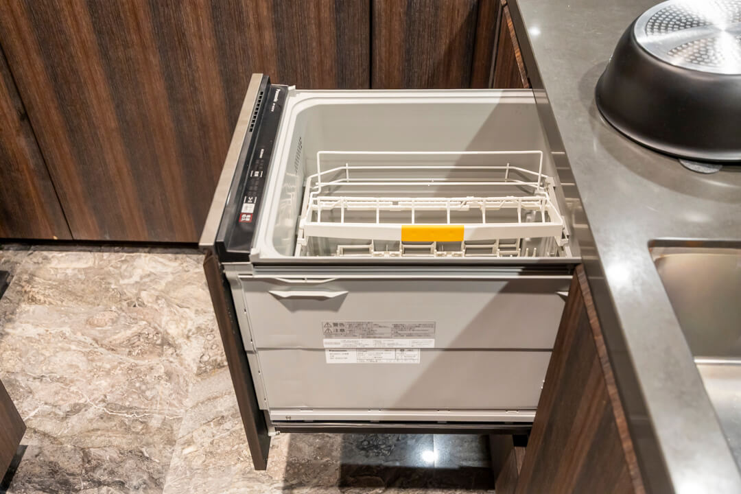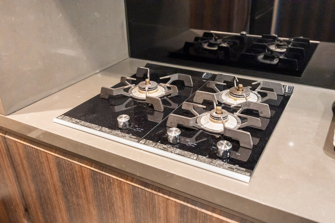 3口ガスコンロ・Miele(ミーレ)製オーブン内蔵で同時調理が叶い、料理のレパートリーも増えそう。後片付けが捗る食洗機も内蔵されています。さらに、シンクにはディスポーザーを搭載。料理後すぐに生ゴミを処理できるので、掃除の手間が軽減され、悪臭の原因を防いでくれます。