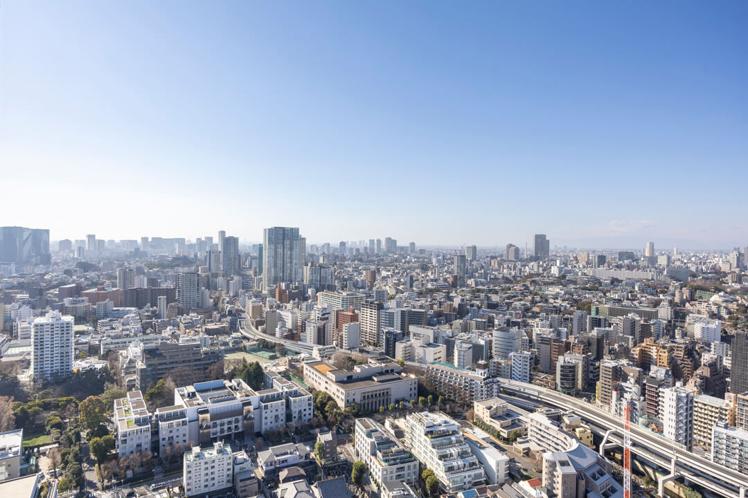 6.00㎡のバルコニー。37階・南西向きならではの、空の広がりと街並みを一望する眺望です。眼下には落ち着いた街並みが広がり、その先には高層ビル群が連なる、奥行きのある眺めをお楽しみいただけます。都市の躍動を感じながらも、室内では穏やかな時間が流れる、上質な眺望です。