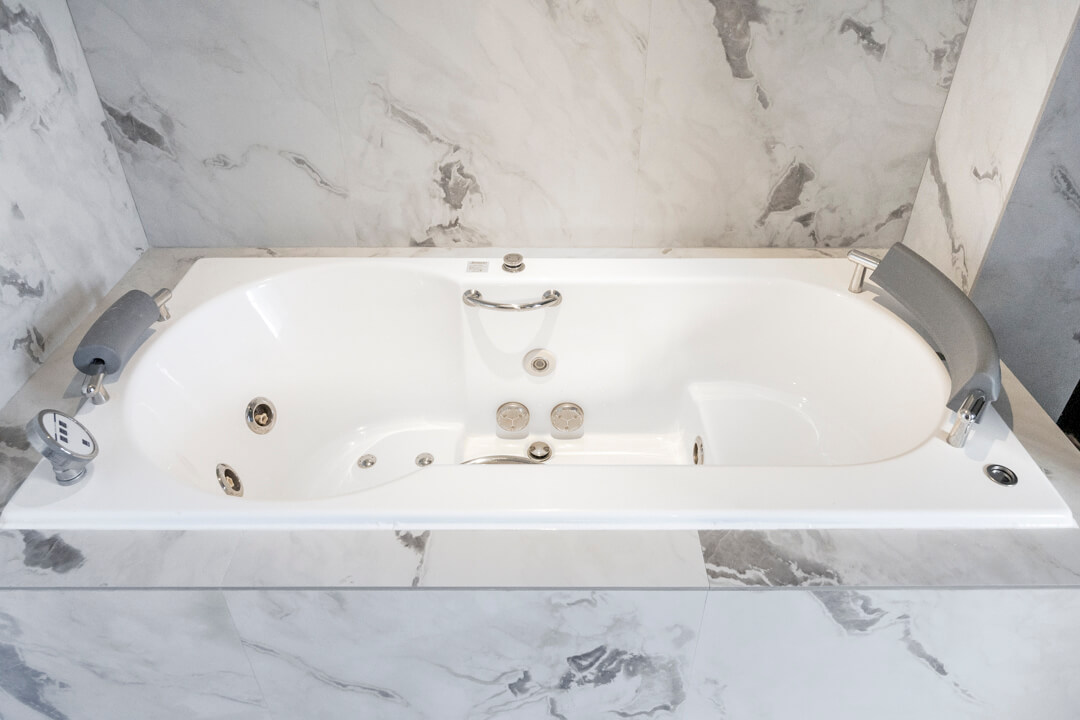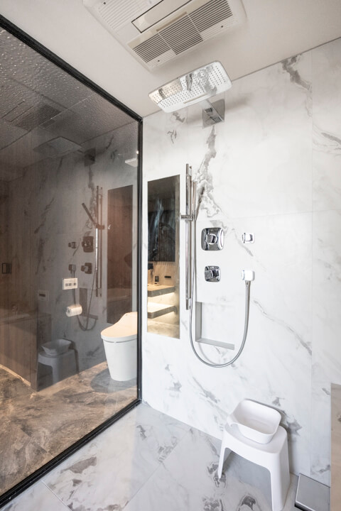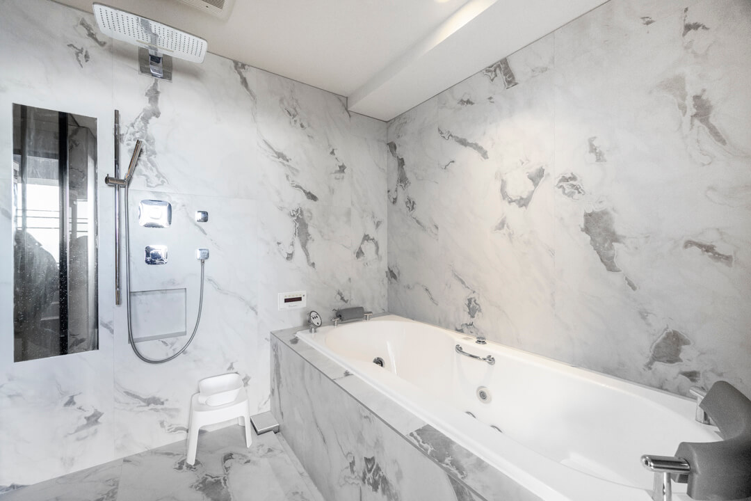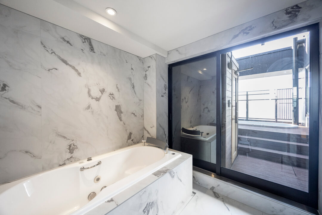 ラグジュアリーな雰囲気が漂うバスルーム。ルーフバルコニーに面し、開放感溢れる空間です。Jaxson製のジェットバス機能搭載で、穴から吹き出す泡の力で身体をほぐしてくれます。シャワーは2種類設置されていて、使い分けが可能。全身でシャワーを浴びることができるオーバーヘッドシャワーでは、高い保温効果が期待できます。癒しのバスタイムを過ごせそうですね。