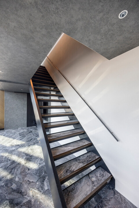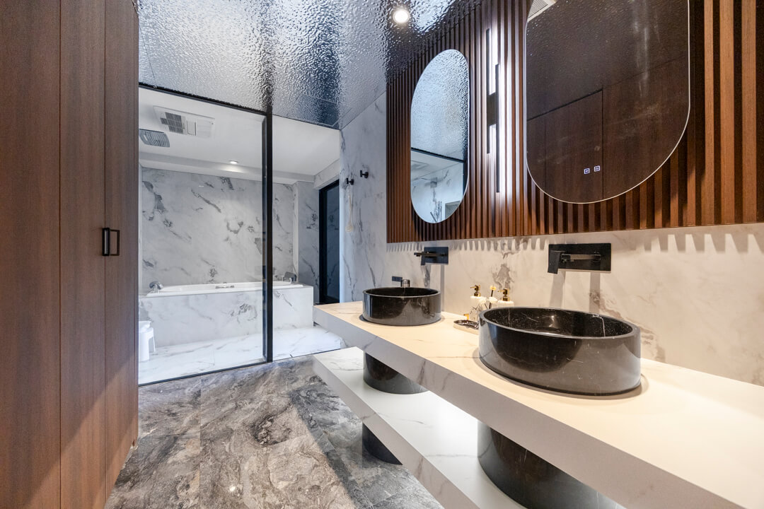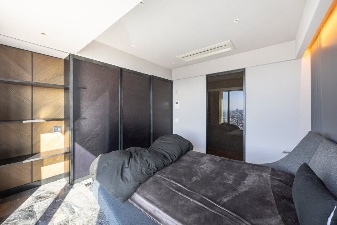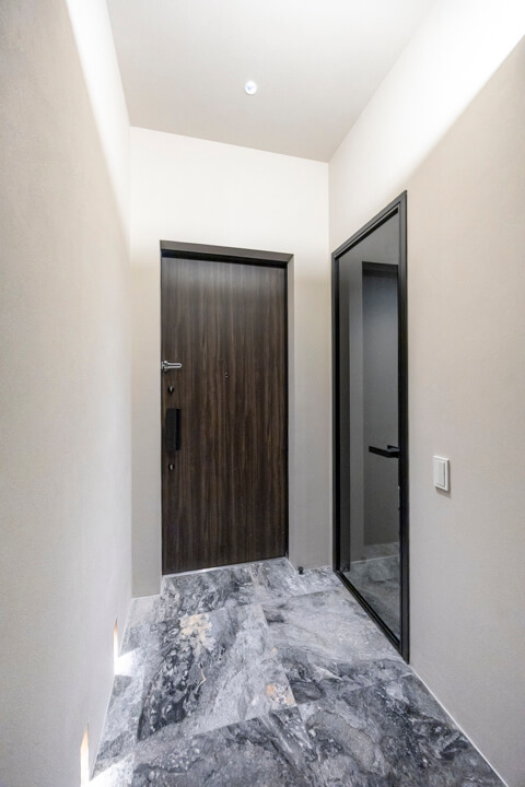 床には大理石フロアを採用し、空間全体に上質で洗練された印象をもたらします。広々とした室内は開放感に満ち、インテリアの配置次第で多彩な過ごし方が叶います。ビルトインエアコンも備え、意匠性と快適性を兼ね備えた住空間です。