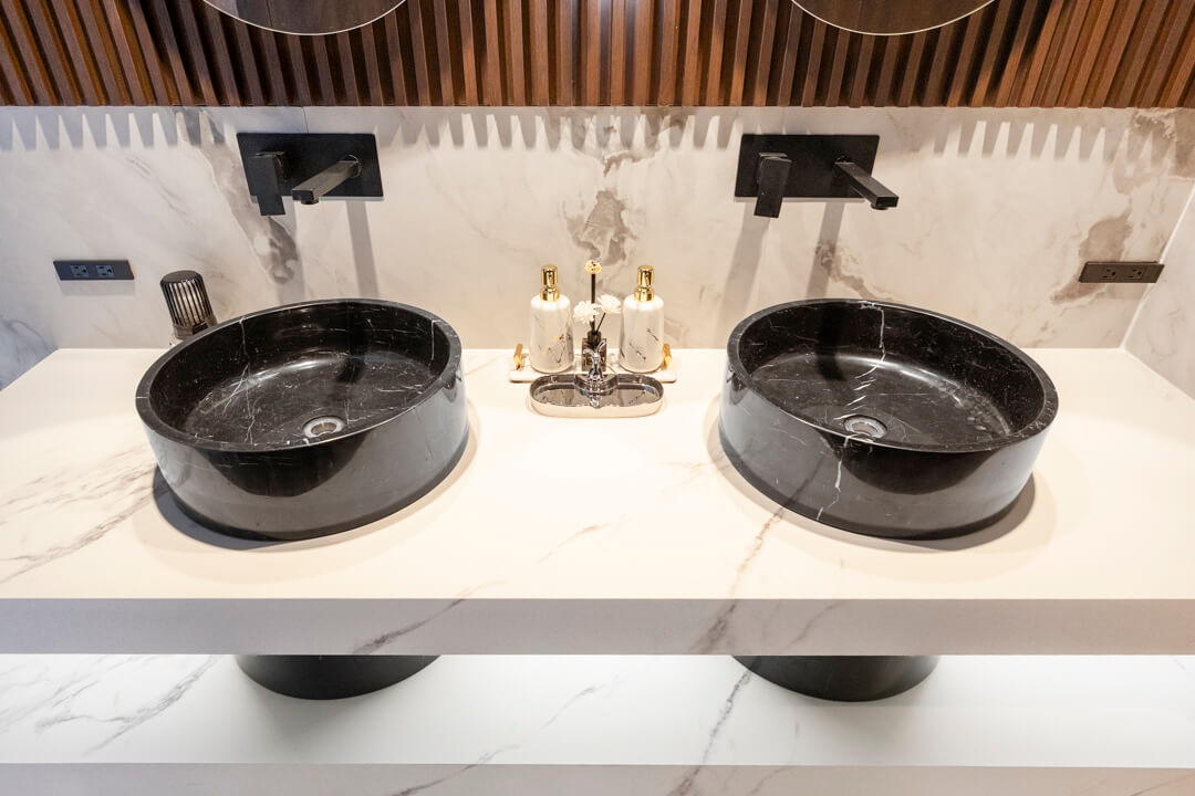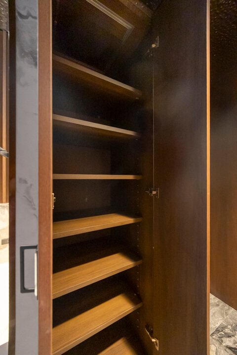 2つの洗面ボウルが並ぶ、ホテルライクな洗面化粧台。2人同時に使用でき、忙しい朝の身支度もスムーズに行うことができます。カウンタースペースにゆとりがあり、化粧品やドライヤーの仮置きができるのも助かりますね。向かい側には大容量のリネン庫があり、いつも清潔な洗面室をキープできそうです。