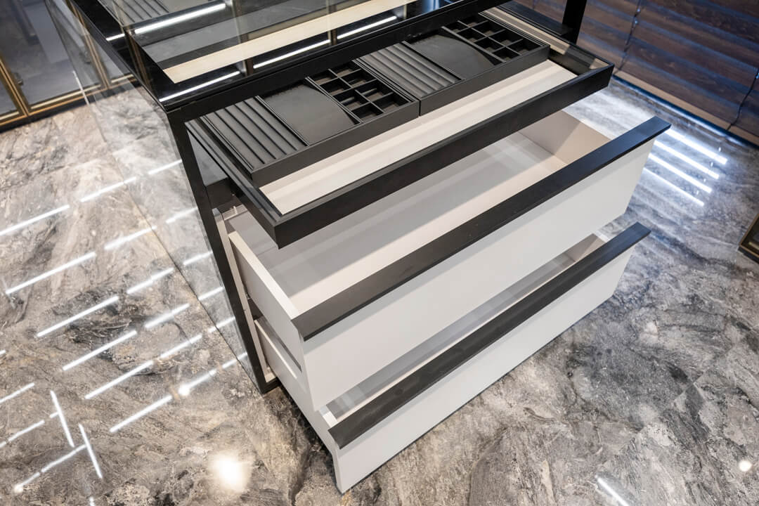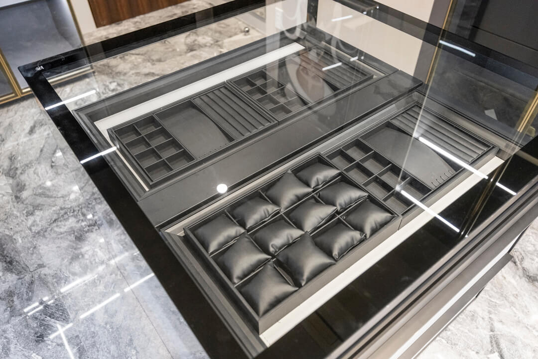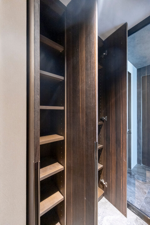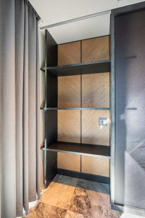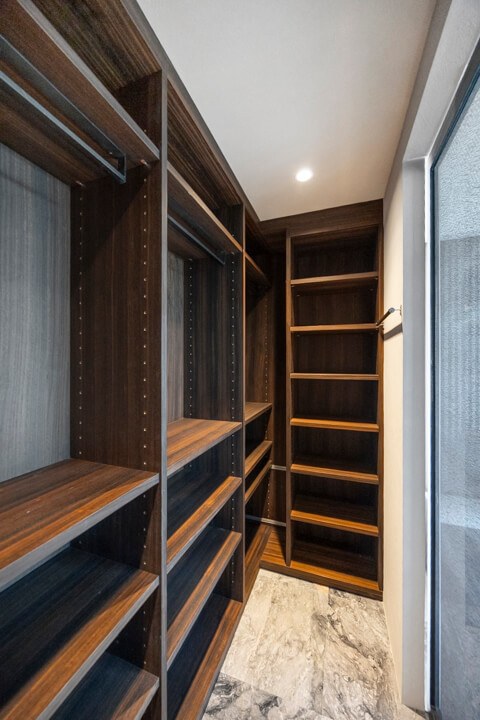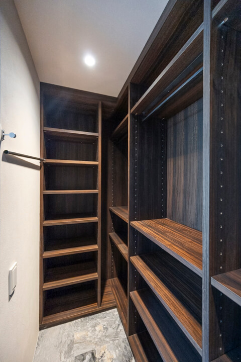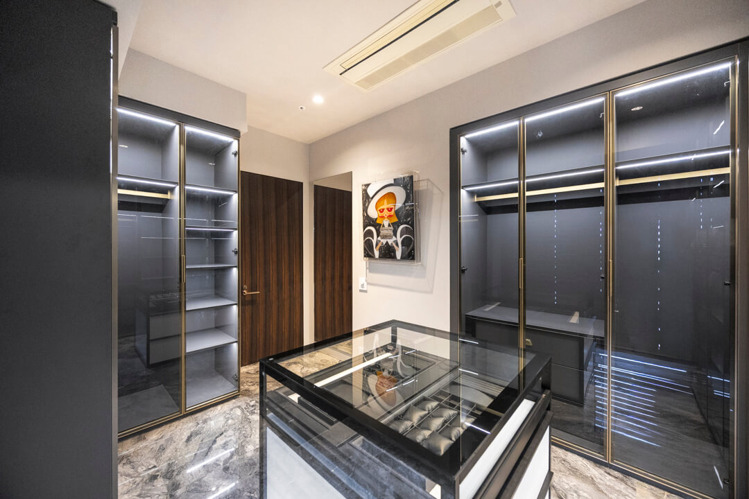 衣装部屋には、ショップディスプレイのようにアクセサリーを美しく収納できる専用スペースを設け、ジュエリーや小物を“見せる収納”として楽しめる設えとなっています。クローゼットに加え、引き出しや棚も備えており、アイテムごとにすっきりと整理が可能。全身鏡付きのため、身支度からコーディネートチェックまでがこの空間で完結します。ビルトインエアコンを備え、衣類やアクセサリーを快適な環境で保管できる点も魅力です。