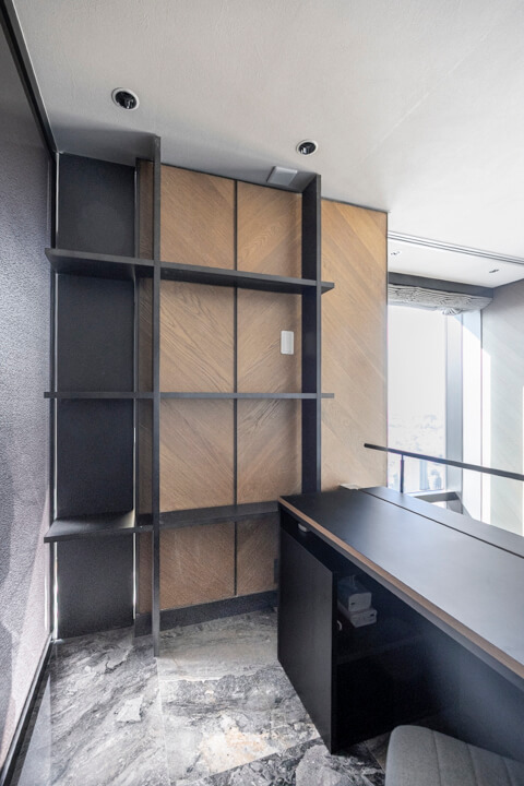 吹き抜けにより窓に囲まれた、38階廊下。伸びやかな景色を堪能できます。突き当たりの一角にはデスクカウンターと飾り棚を設え、眺望を楽しみながら過ごせるワークスペースになっています。