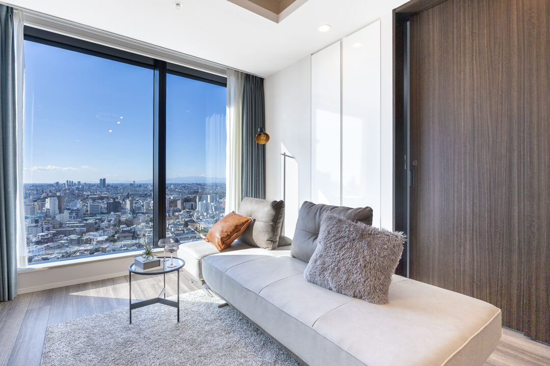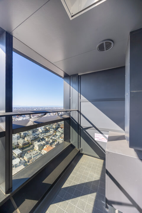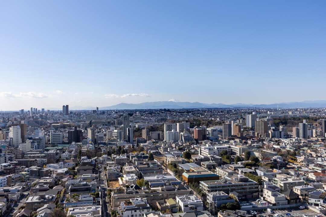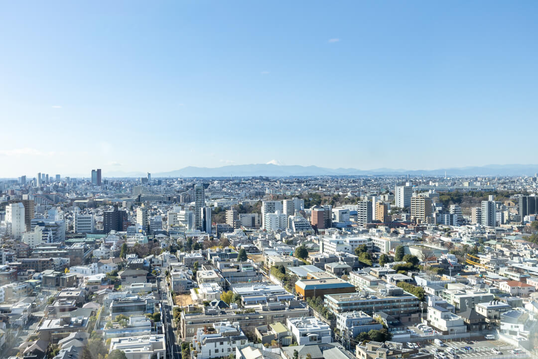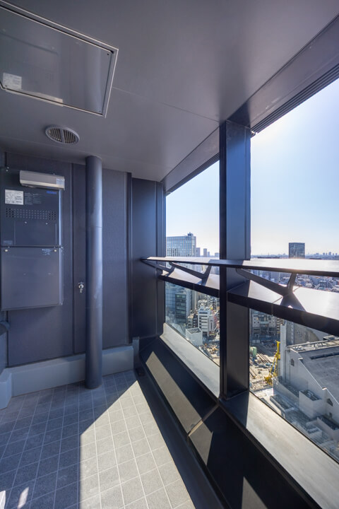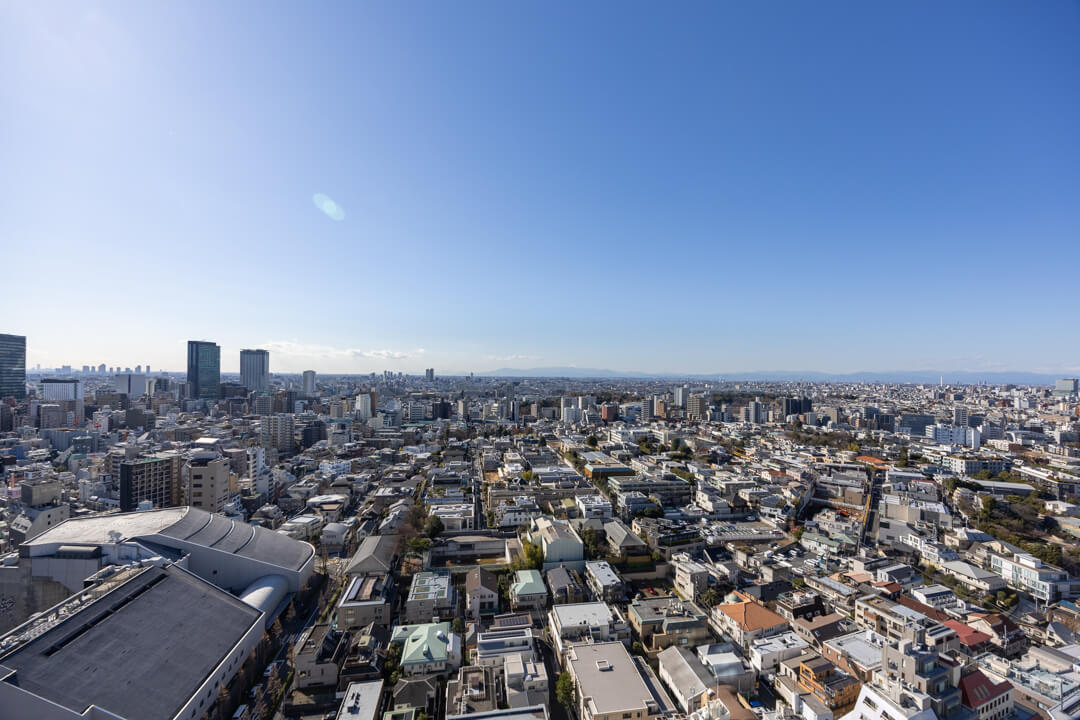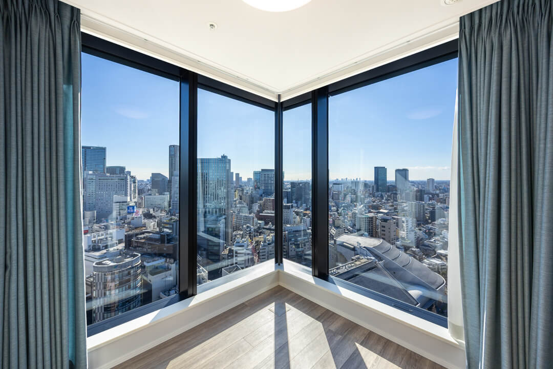 渋谷を一望できる開放感あふれる景色が魅力的。渋谷エリアのビル群や、天候によっては富士山も望むことができます。洋室(約5.4帖)に面したバルコニーは、手すりが透明になっていて開放感もUP。