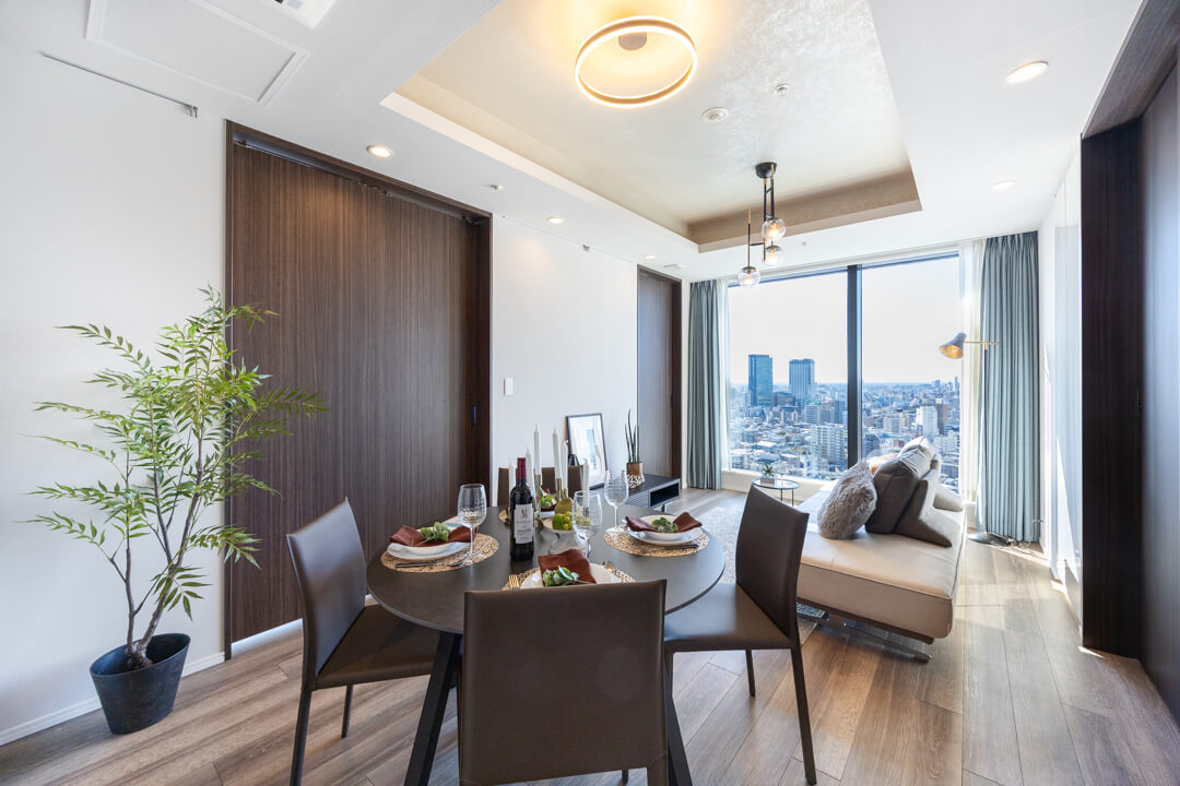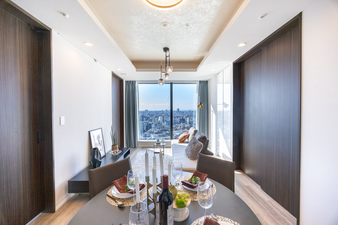 キッチンスペースを含め、約15.1帖のLDK。空間の印象を決める開放的な眺望がお出迎えしてくれます。南西向きで陽当りも良好。渋谷を一望できる景色が広がっています。天候によっては富士山も望むことができます。リビングの一角には収納スペースも設けられていて、生活雑貨の整頓に便利です。