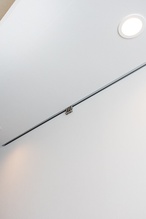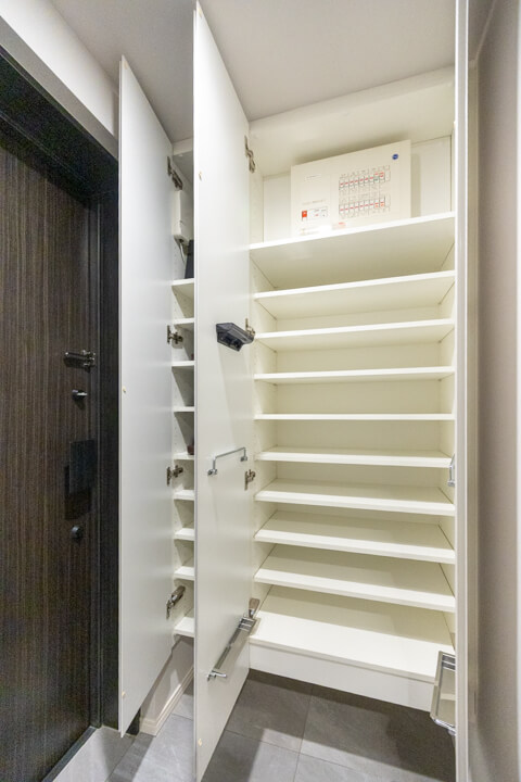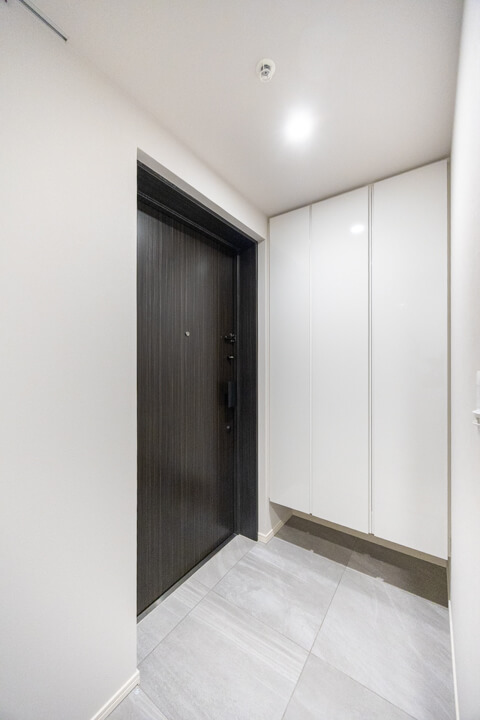 玄関には3枚扉のシューズボックス付きで靴がたっぷり収納可能。壁の一部にピクチャーレールが設置されているので、アートや写真を飾って空間に彩りもプラスできます。また、廊下には石目調のアクセントウォールが施されていて、ホテルライクな高級感のある雰囲気。