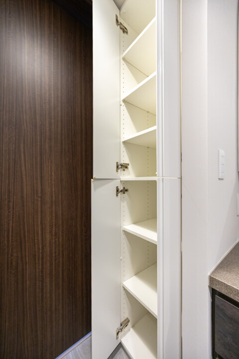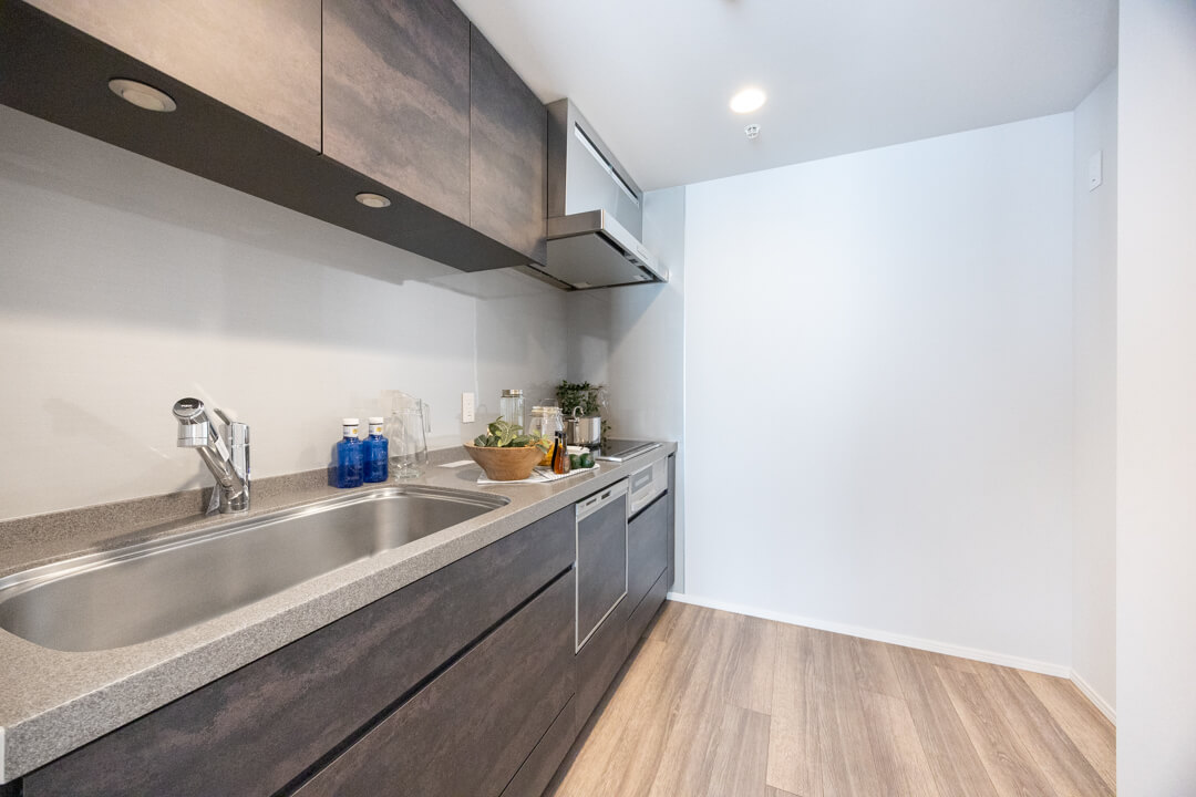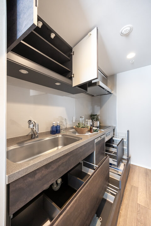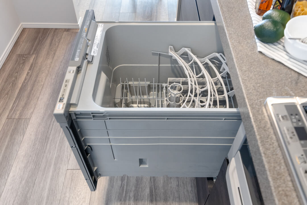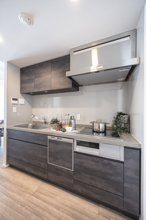リビングダイニングと空間分けされたキッチンスペース。キッチンまわりの生活感をさりげなく目隠しできます。手入れがしやすいIHクッキングヒーター、家事の時短に心強い食洗機付きのシステムキッチン。モノの出し入れがしやすい引き出し式のキャビネットで使い勝手の良さもポイントです。