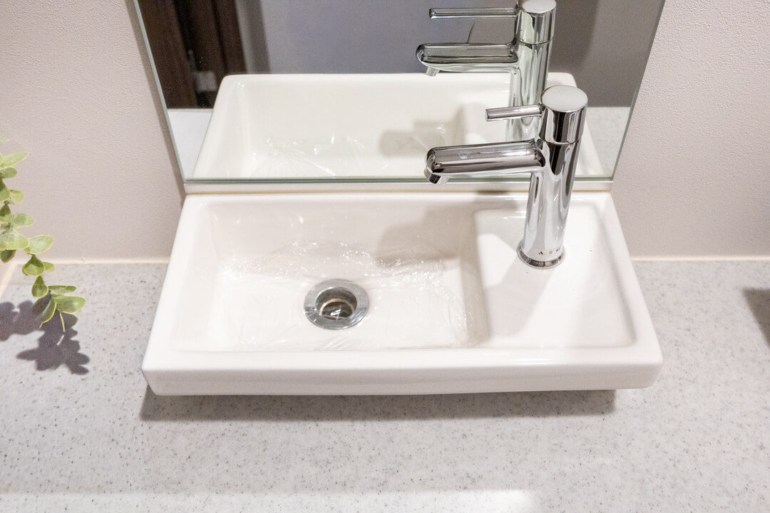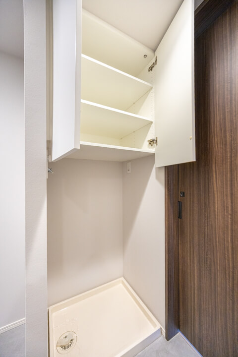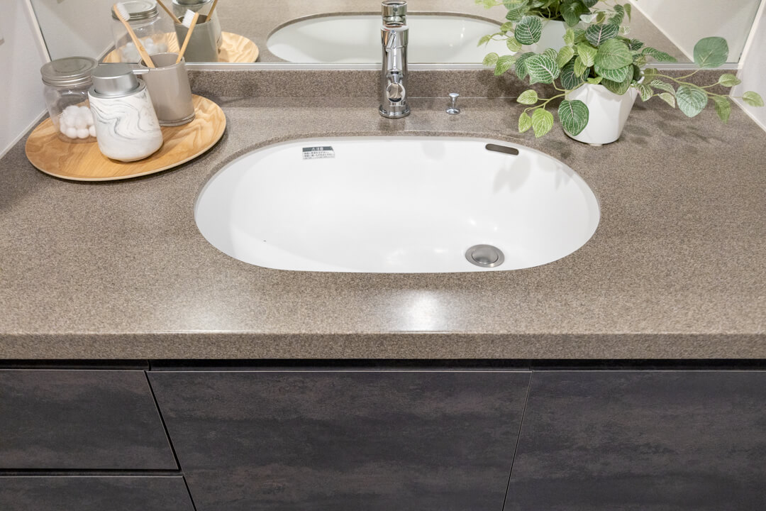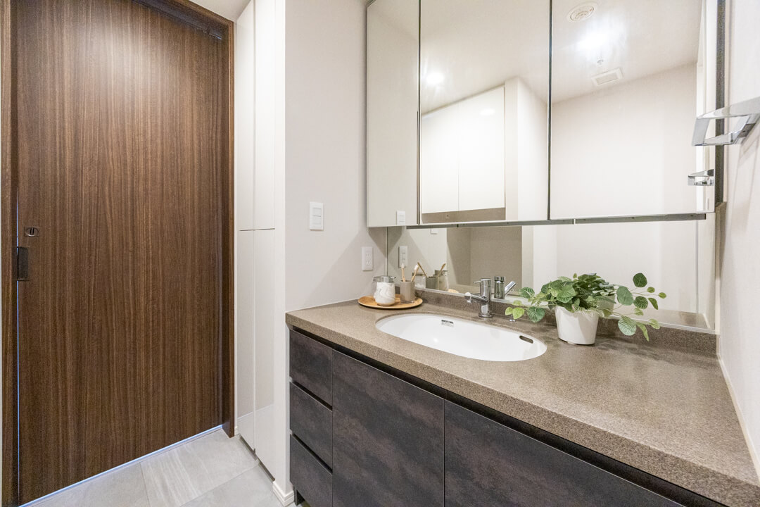 リビングダイニングから直接出入りできる洗面室。家事動線が短縮され効率化もUP。来客の際もスムーズに案内できます。洗面化粧台は洗面まわりの小物がすっきり整頓できるミラーボックスで、いつでも整った状態をキープできそう。別途リネン庫も付いていて、収納スペースがしっかりと確保されています。