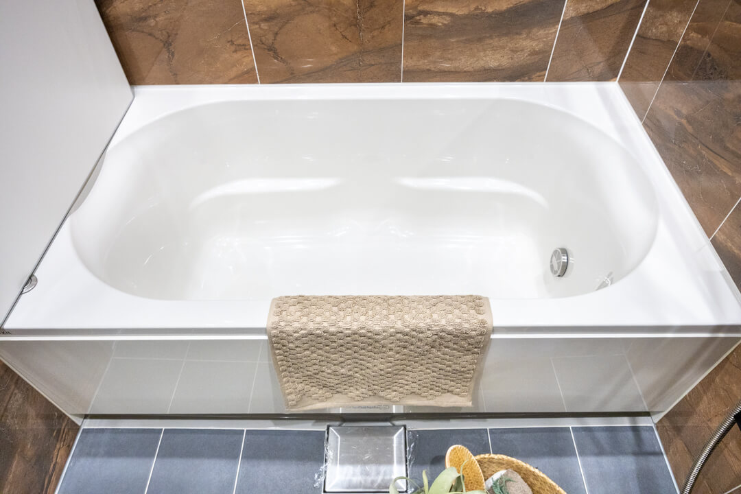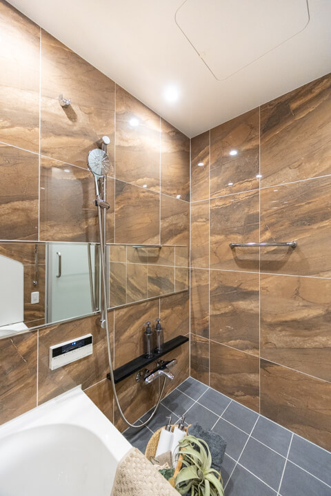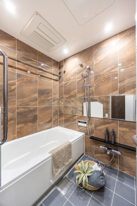 1418サイズのバスルーム。タイル貼りで重厚感と上質な雰囲気が感じられます。追い炊き機能の他、乾燥・換気・暖房・涼風の4つの機能が備わっていて、一年中快適にバスタイムが楽しめます。ランドリーパイプも2本付いていて、雨の日や冬場の洗濯にも困りません。シャワー水栓も新規交換されています。