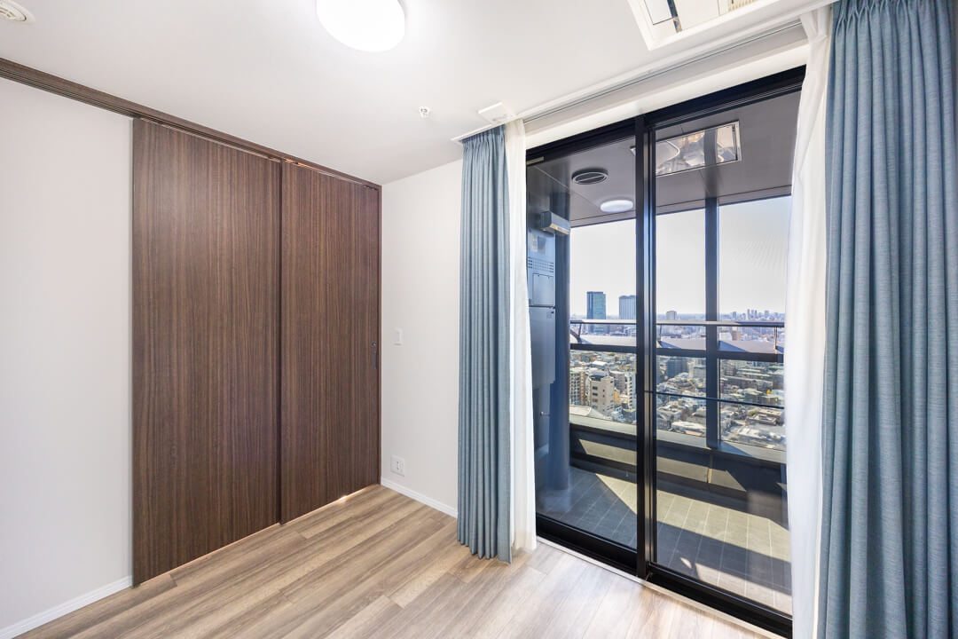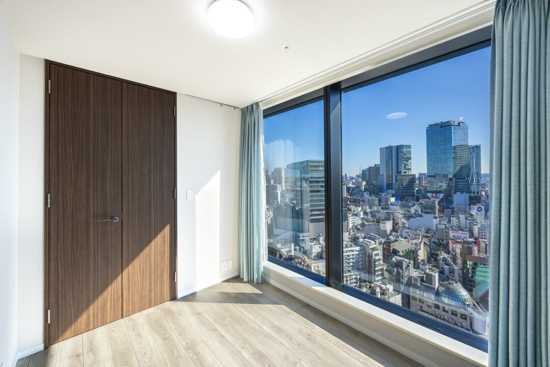 約5.1帖の洋室。洋室は全てリビングダイニングから直接出入りでき、家族とのコミュニケーションが取りやすくなっています。南東向きで陽当り良好、渋谷のビル群が望める開放的な景色が望めます。夜には夜景も楽しめそうですね。