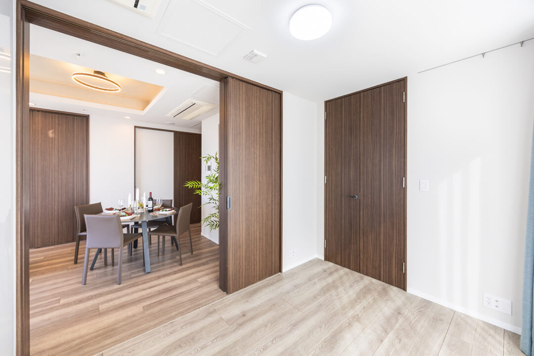 リビングダイニングから各洋室へ直接出入りできる動線が特徴的。家族とのコミュニケーションが取りやすくなっています。また、キッチンスペースはリビングと空間分けされていて、生活感を感じさせないすっきりとした印象です。