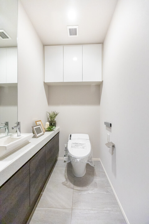廊下に面したレストルーム。空間がすっきり見えるタンクレストイレです。手洗いカウンター、収納スペース、ウォシュレットも備わっています。ウォシュレットリモコンはスティック型でスタイリッシュな雰囲気。