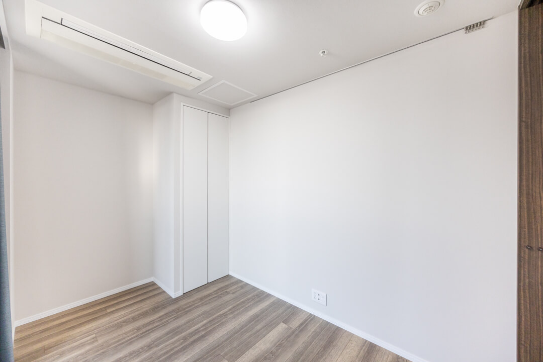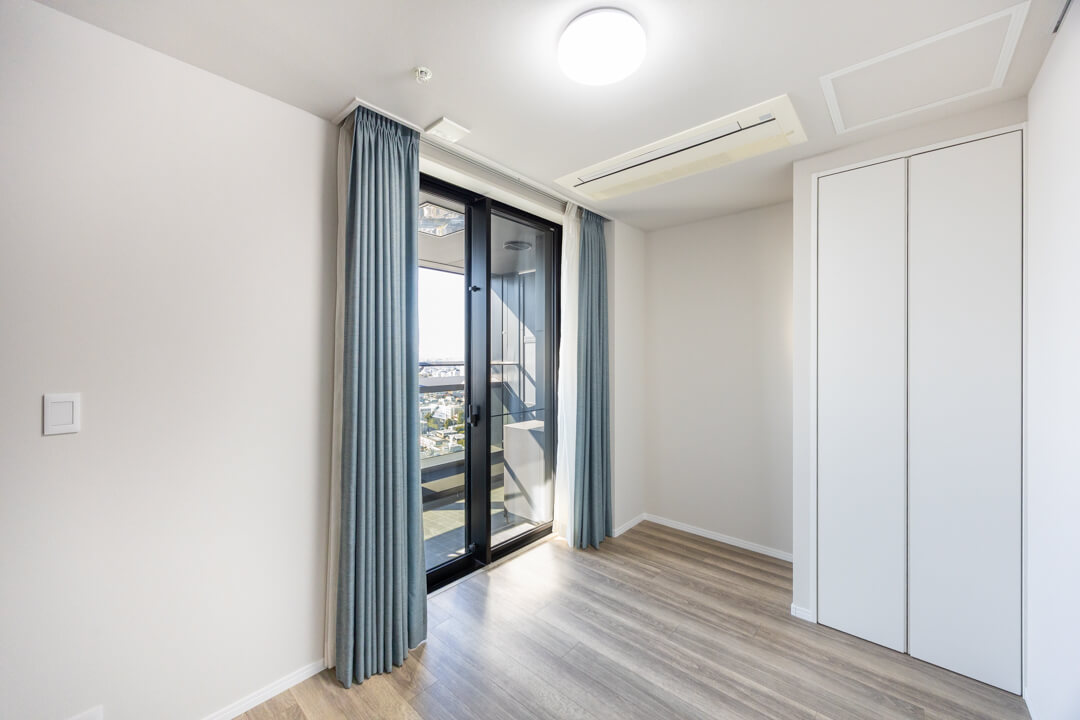 約5.4帖の洋室。自然な光が入る南西向き、バルコニーも付いています。バルコニーの手すりが透明になっているので、景色を遮らず室内からも眺望良好。クローゼットとビルトインエアコンも備わっています。