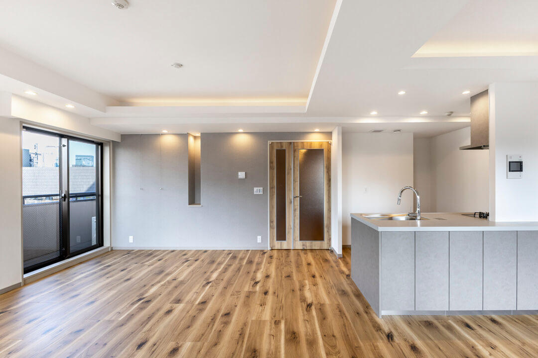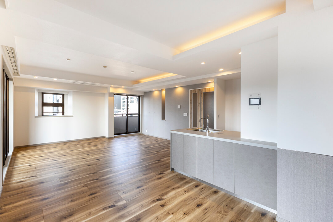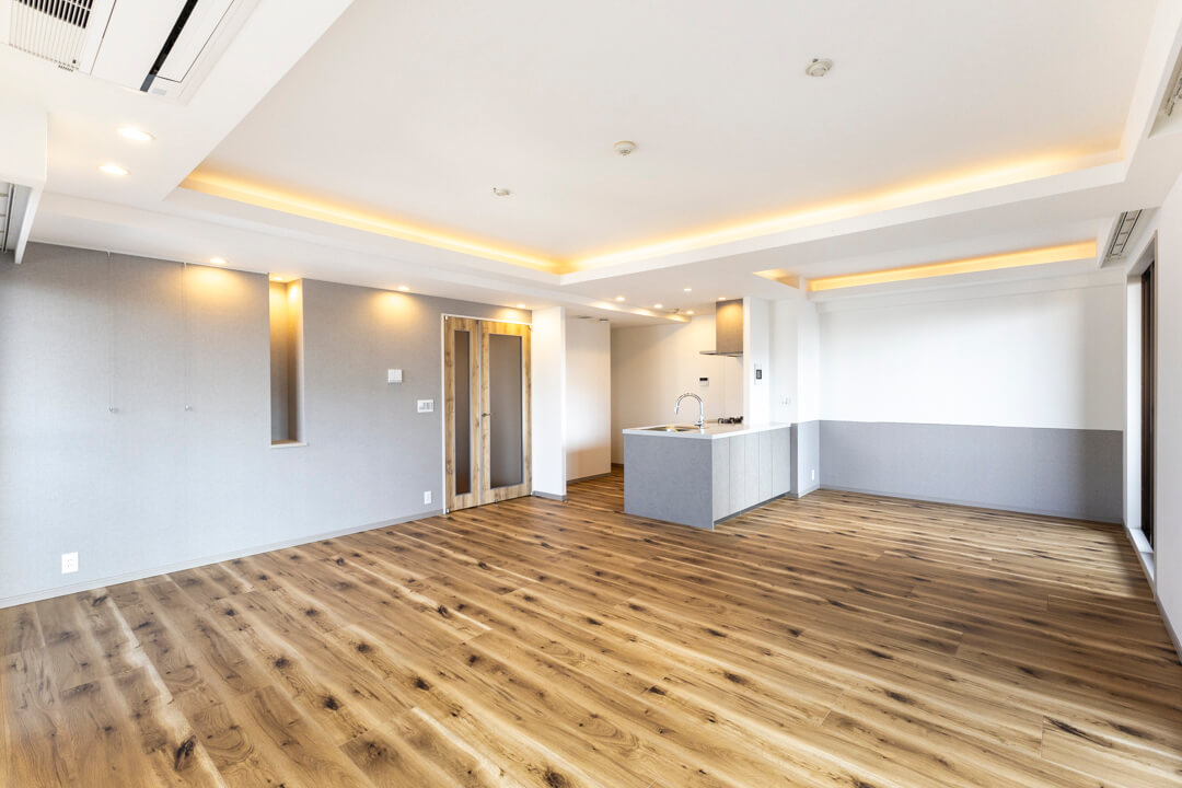 キッチンスペースを含めて約22.1帖の広々としたリビングダイニング。ゆとりある空間設計により、ダイニングとリビングを緩やかにゾーニングしながらも、一体感のある開放的な暮らしを叶えます。南西2面採光で窓が多く、日中はやわらかな陽光が室内全体に行き渡る、明るい空間。天井に施された間接照明が時間帯によって異なる表情を演出し、日常を上質に彩ります。