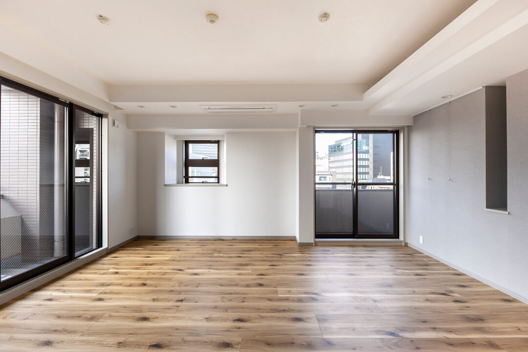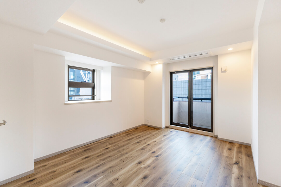 約9.2帖の洋室1。ゆとりある広さで主寝室にぴったりです。自然光が届く北西2面採光で、風通しの良さも魅力的。間接照明のグラデーションが気持ちを落ち着かせ、リラックスタイムへと誘ってくれそうです。