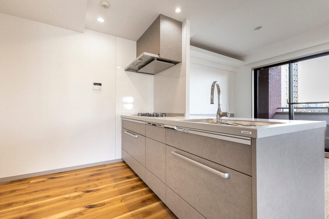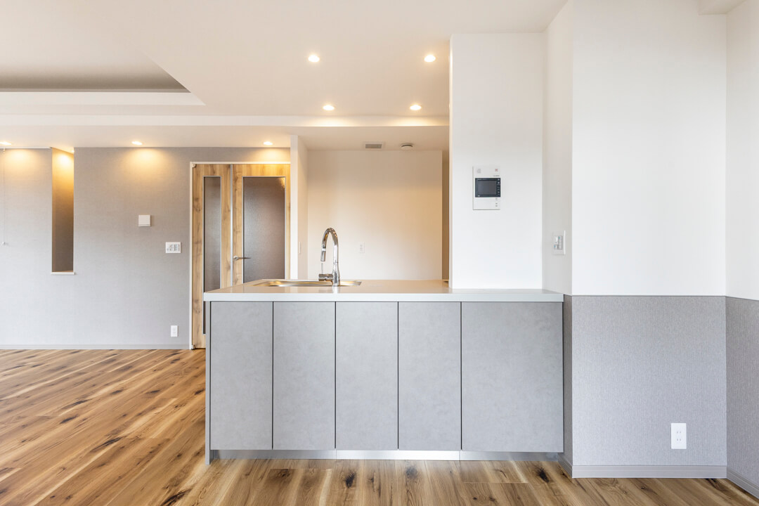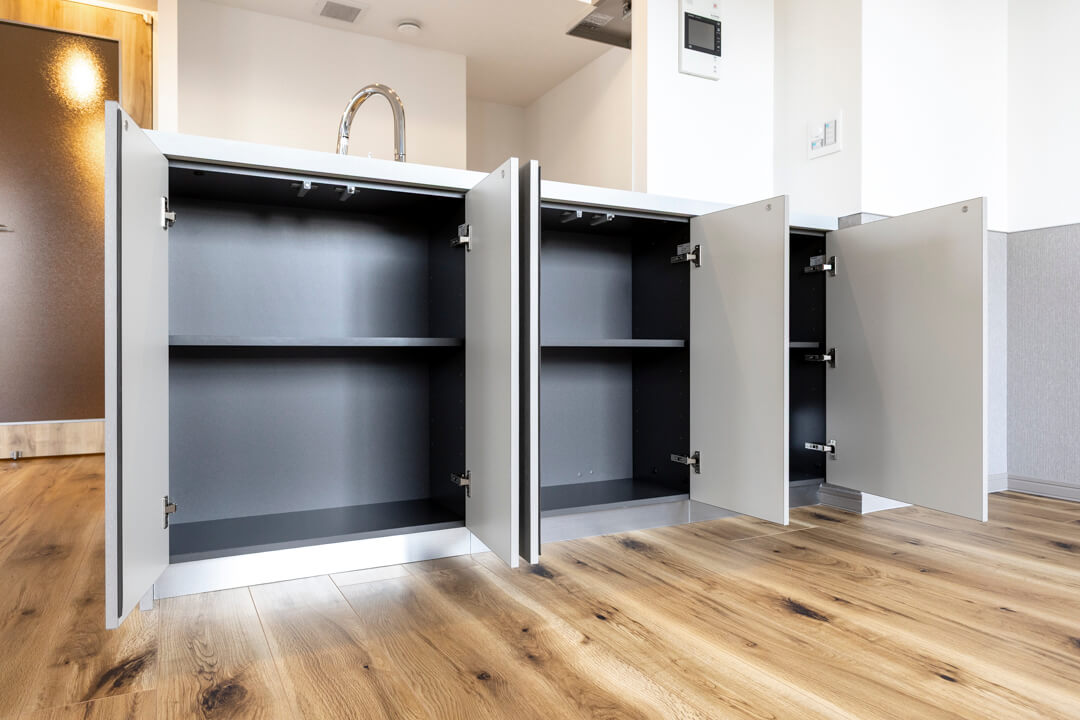 グレートーンでスタイリッシュなキッチン。シンク側からはリビングダイニングを見渡すことができ、開放的な気分で調理ができます。家族のコミュニケーションも増えそうですね。カウンター下にはリビング側から出し入れできる収納棚も完備。日用品やダイニングまわりのアイテムをすっきりと収めることができ、空間を美しく保つことができます。