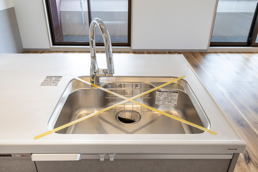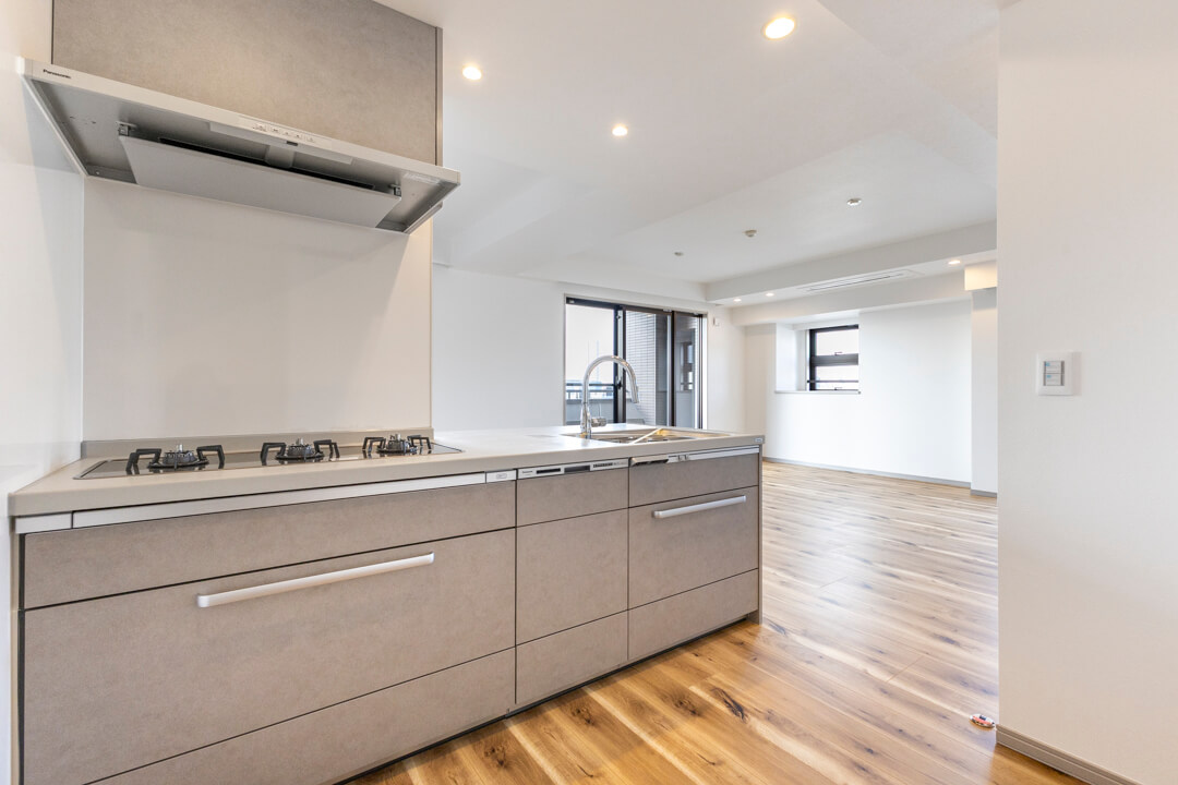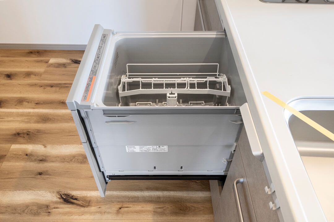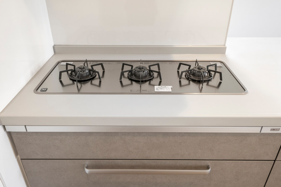 コンロは3つの鍋を横並びにしてゆったり使えるトリプルワイドタイプ。フライパンの持ち手が飛び出ないので、引っかかってしまうことがなくて安全です。後片付けの時短に役立つ食洗機も内蔵されていて、忙しい家事をサポートしてくれます。