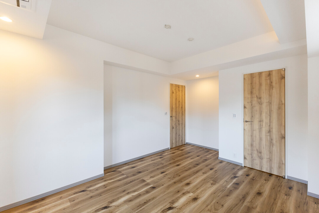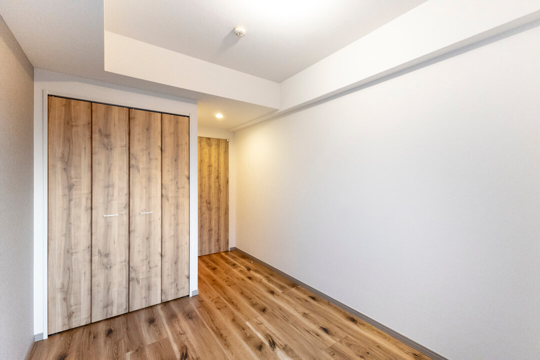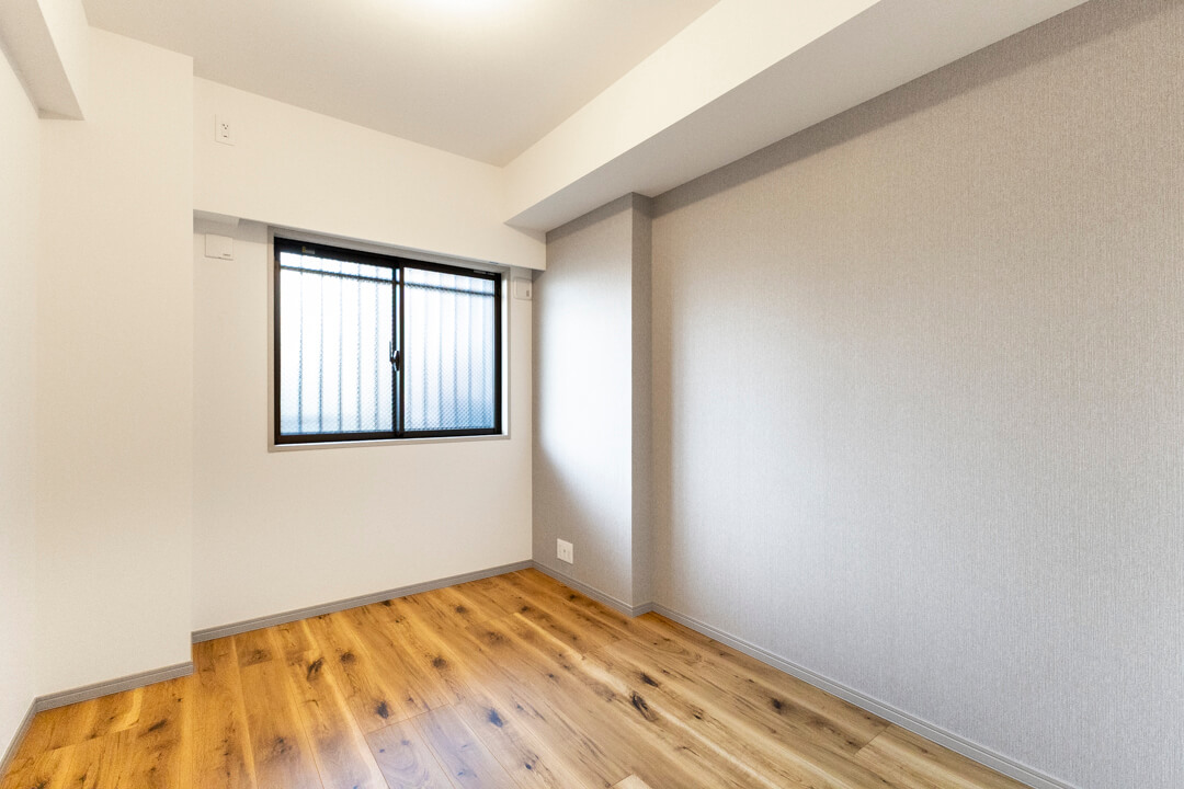お隣にあるのは約6.1帖の洋室3。窓&クローゼット付きで使い勝手の良い空間です。さりげないアクセントウォールが上質感をもたらし、インテリアのテイストを選ばずコーディネートを楽しむことができます。