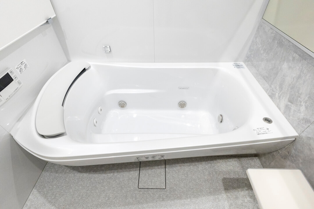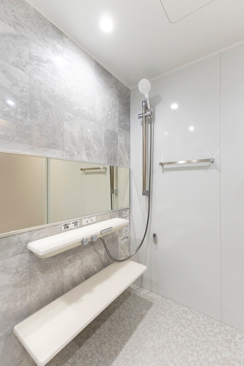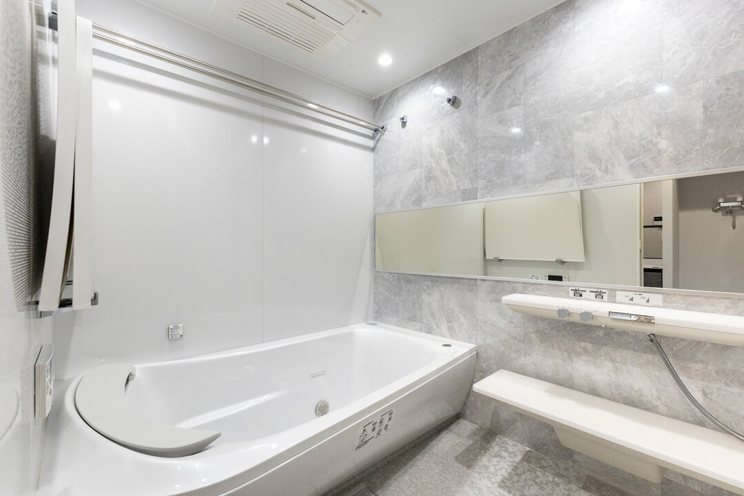 ゆったり入浴できる1620サイズのバスルーム。ワイドミラーが奥行きをもたらし、上質な空間が広がります。浴室換気乾燥暖房機・追い焚き機能完備で1年中快適なバスタイムに。ヘッドレストの下と腰の位置からお湯が流れる「楽湯」機能も搭載されていて、全身をしっかり温めることができます。炭素の膜で覆われた「お掃除ラクラク鏡」は、水あかのこびり付きを抑えることができ、お手入れ簡単です。