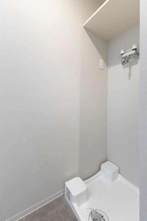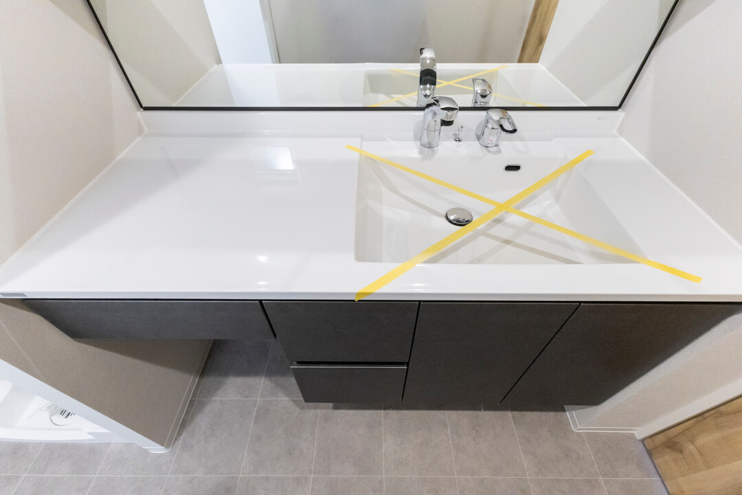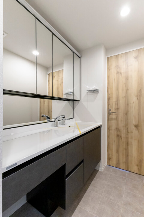 白と黒のコントラストが美しく、スタイリッシュな洗面化粧台。大きな鏡付きで身だしなみを整えるのに便利です。洗面ボウルが片側に寄せられていて、カウンタースペースが広く確保されているのもポイント。カウンター下には椅子を置くことができ、座った状態で落ち着いて身支度を行うことができます。