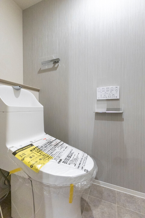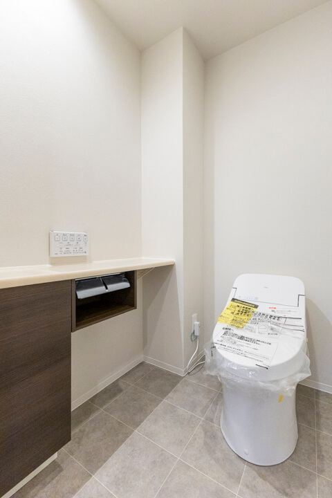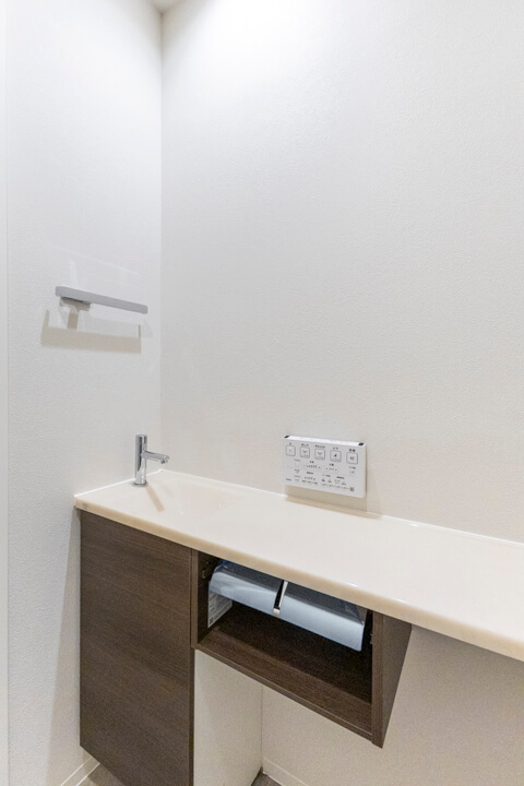 レストルームは2か所に設けられ、いずれも廊下に面した独立性の高い空間です。リビング近くのレストルームには手洗いカウンターを備え、ゲスト用としてもスマートに使うことができます。どちらもTOTO製の洗浄機能付きトイレを採用し、便フタは自動開閉式。日常の使い心地にも配慮されています。