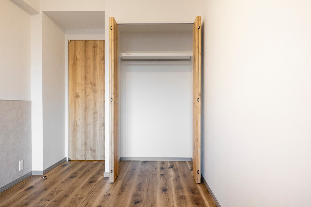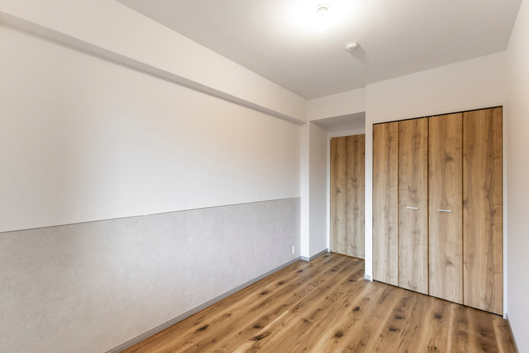 約5.8帖の洋室2。ポーチに面した窓からやわらかな光が差し込み、穏やかな時間が流れる空間です。グレー系の腰壁がさりげないアクセントとなり、落ち着きをもたらします。4枚折れ戸のクローゼット完備で収納スペースもしっかり確保されています。