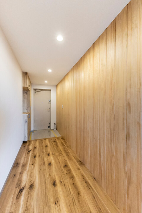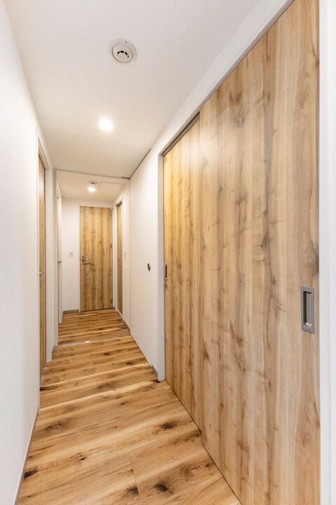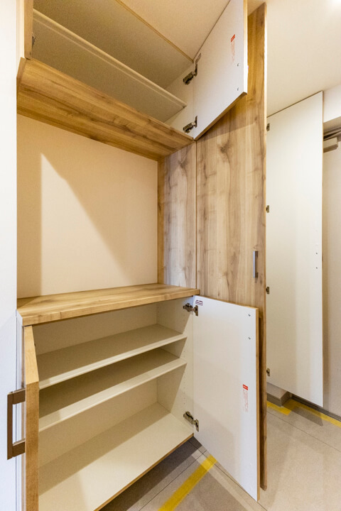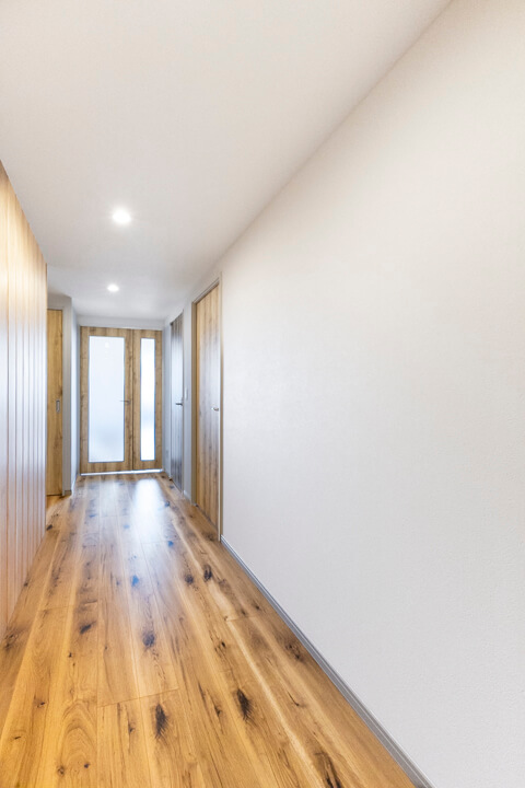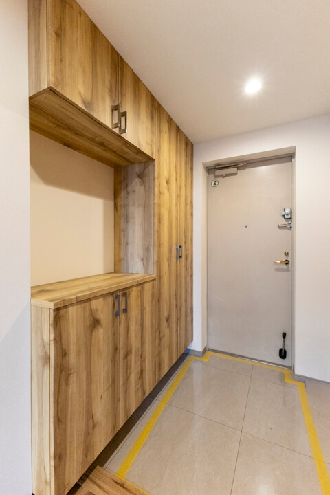 木目基調で温かみを感じる玄関ホール。人感センサー搭載で、いつも明るく出迎えてくれます。荷物で両手が塞がっている時や夜遅く帰宅した時に、スイッチを探す手間がかからず助かりますね。大容量のシューズボックス完備で散らかりがちな靴をすっきり収納可能◎。廊下にもクローゼットがあり、日用品ストックや掃除用品の収納に重宝しそうです。