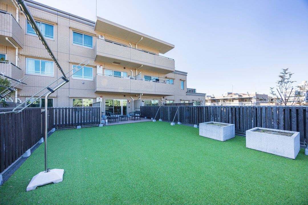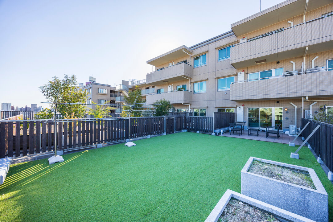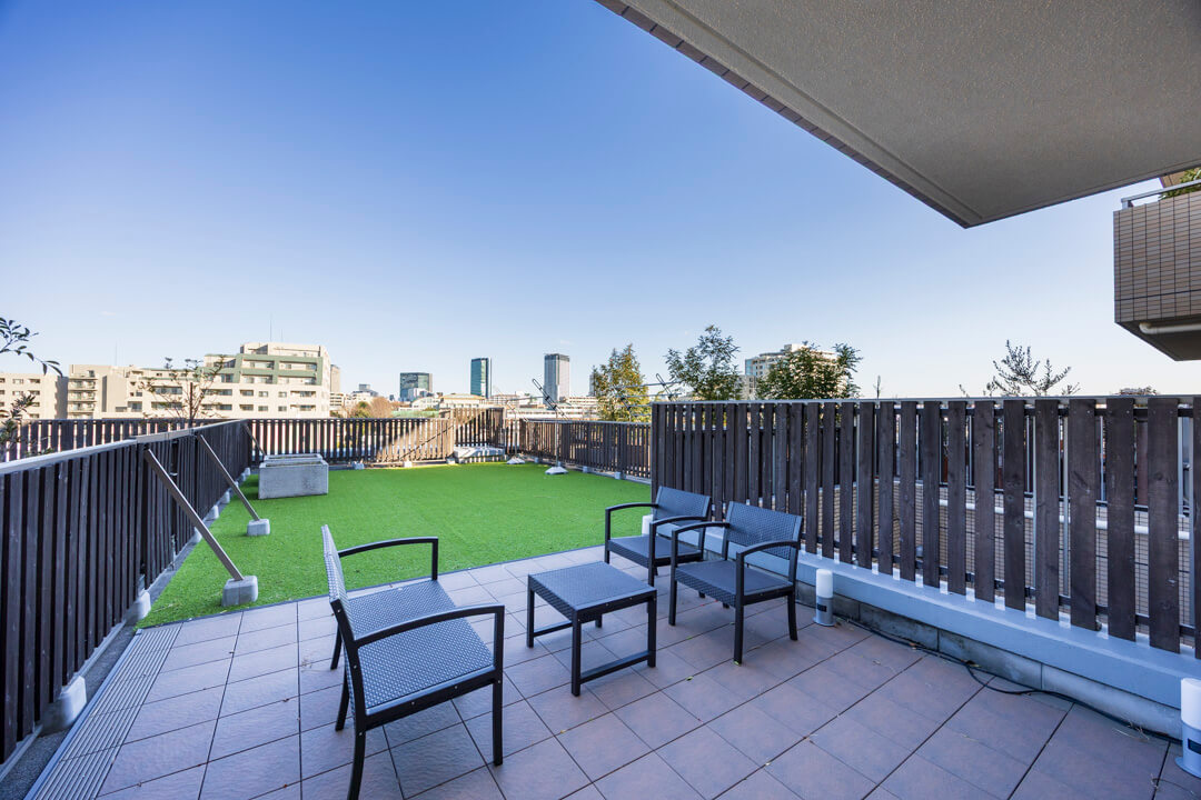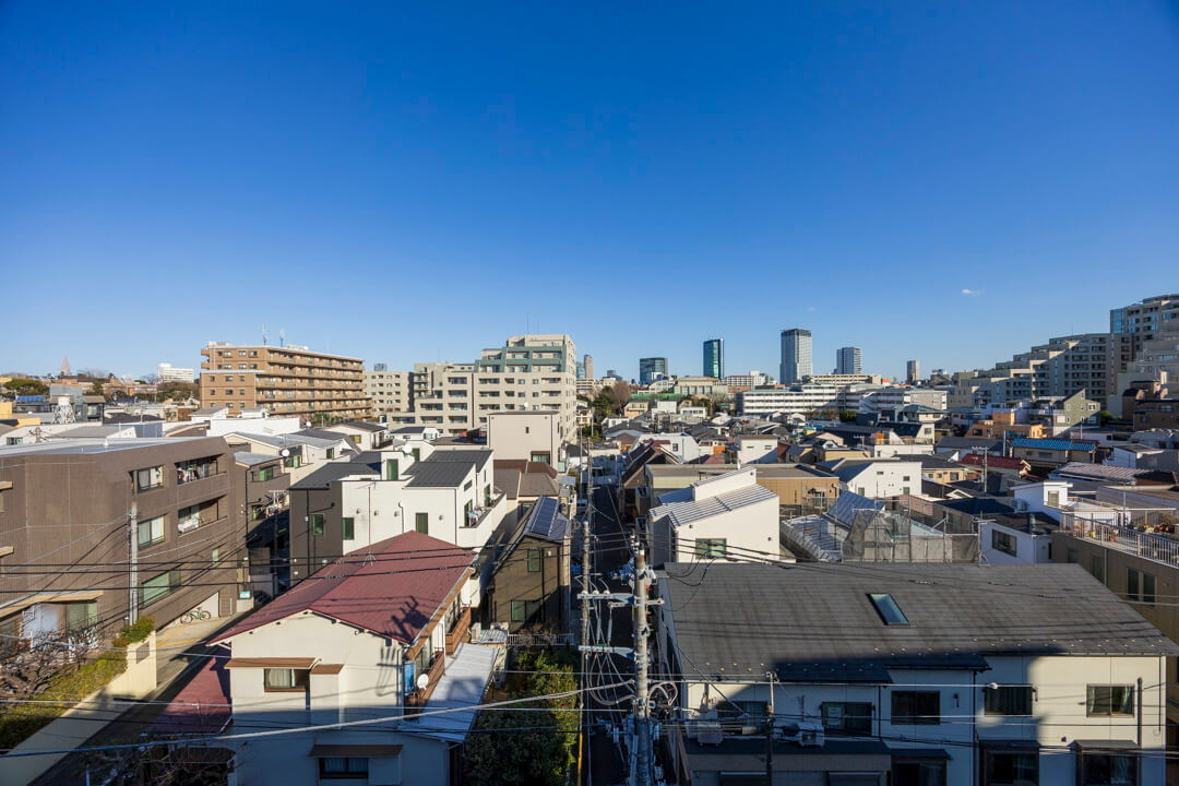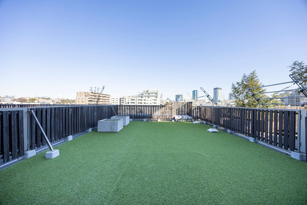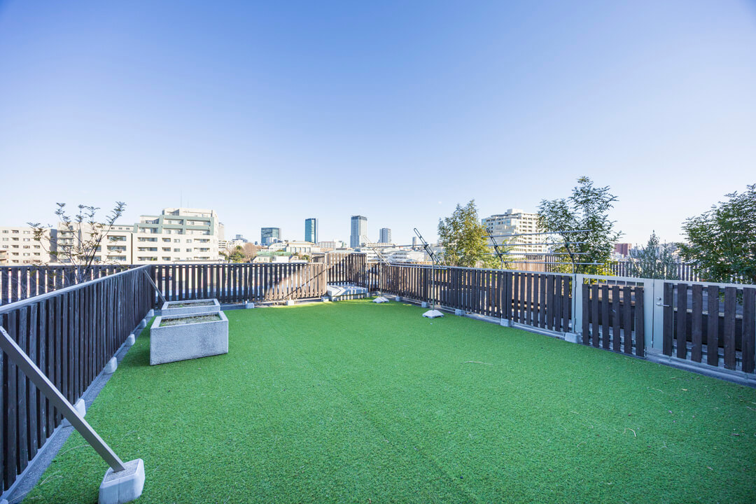 約78.97㎡の大型ルーフバルコニーが付いています。人工芝&磁器タイルを新規で敷設済みで雰囲気◎。テーブルセットなどを配置してティータイムを楽しんだり、植物を置いたり、自分好みの空間に演出することができますよ。目の前には、世田谷の住宅街が見渡せる、開放感溢れる眺望が広がります。日当たりも良好で、洗濯物も良く乾きそうです。蛇口付きなのも便利ですね。