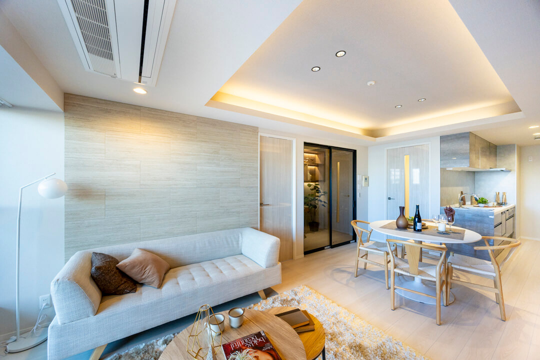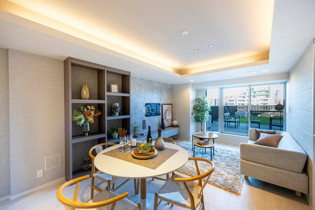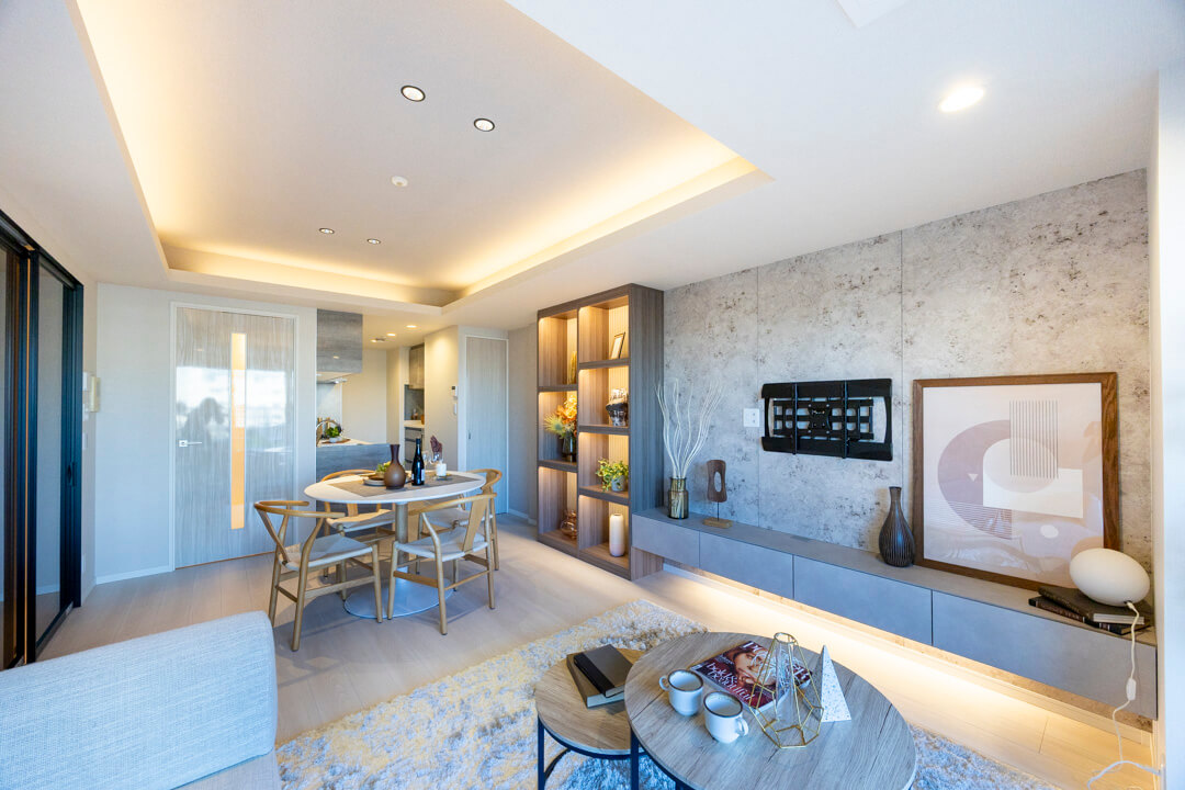 約15.4帖の広々としたリビングダイニングキッチンです。窓からはルーフバルコニーが望め、空間のつながりを感じます。また、折り上げ天井や飾り棚には間接照明があしらわれていて、お部屋を上品な雰囲気に演出してくれています。