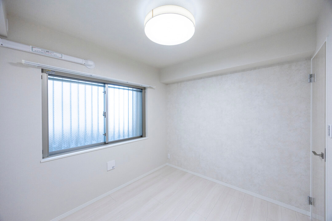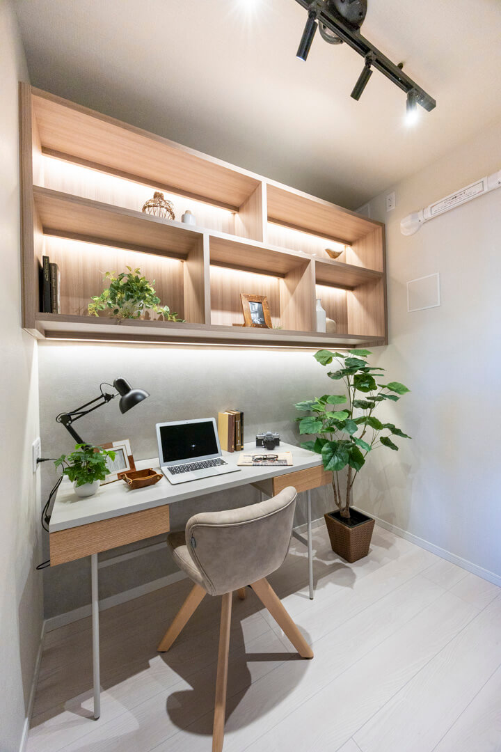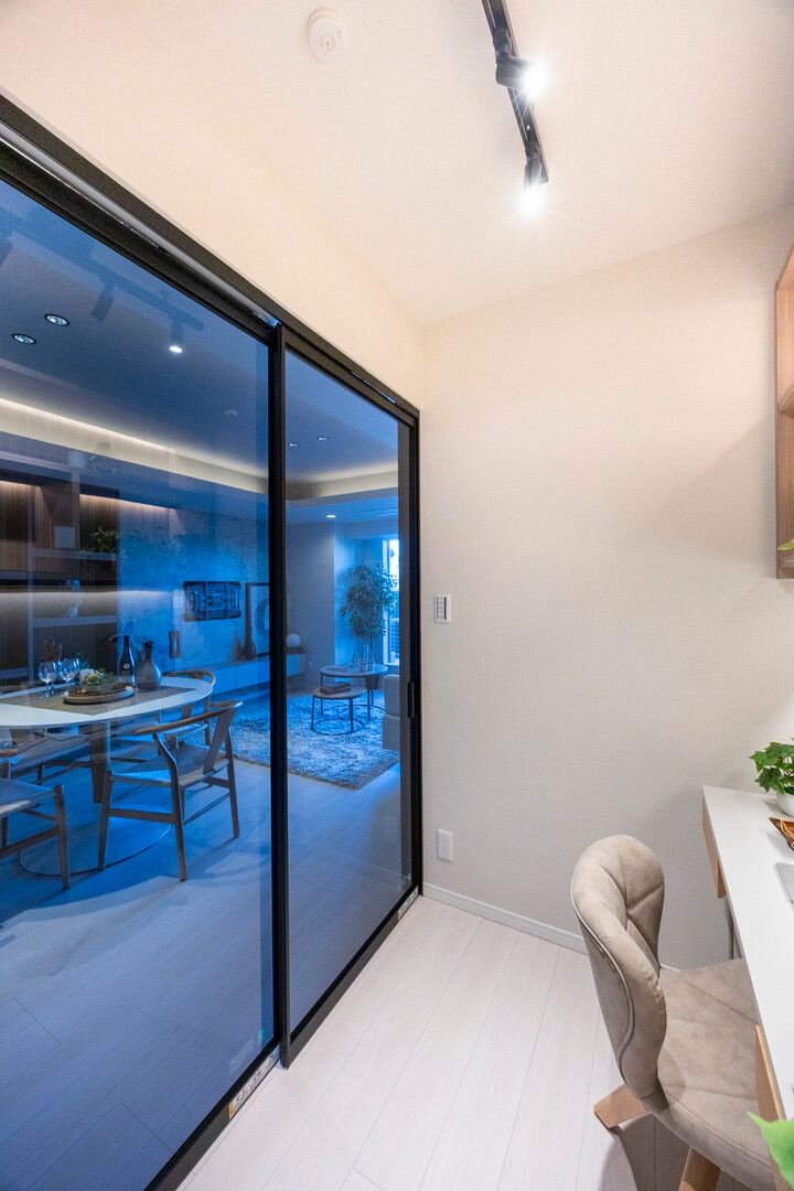 約2.2帖のサービスルームです。コンパクトな空間ですが、飾り棚が設置されていて、書斎やリモートワークなどにぴったり。扉は透け感があって、空間に圧迫感を与えないのも嬉しいポイントです。