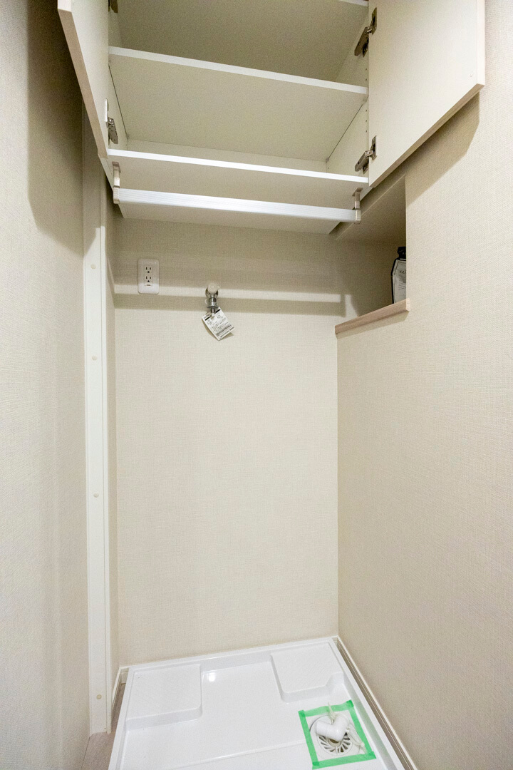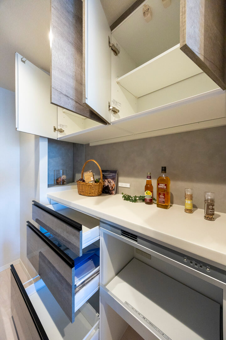 キッチンの背面側にはカップボードが備え付けられています。調味料や食器などを収納できるだけでなく、電子レンジなどを置くこともできるので便利です。